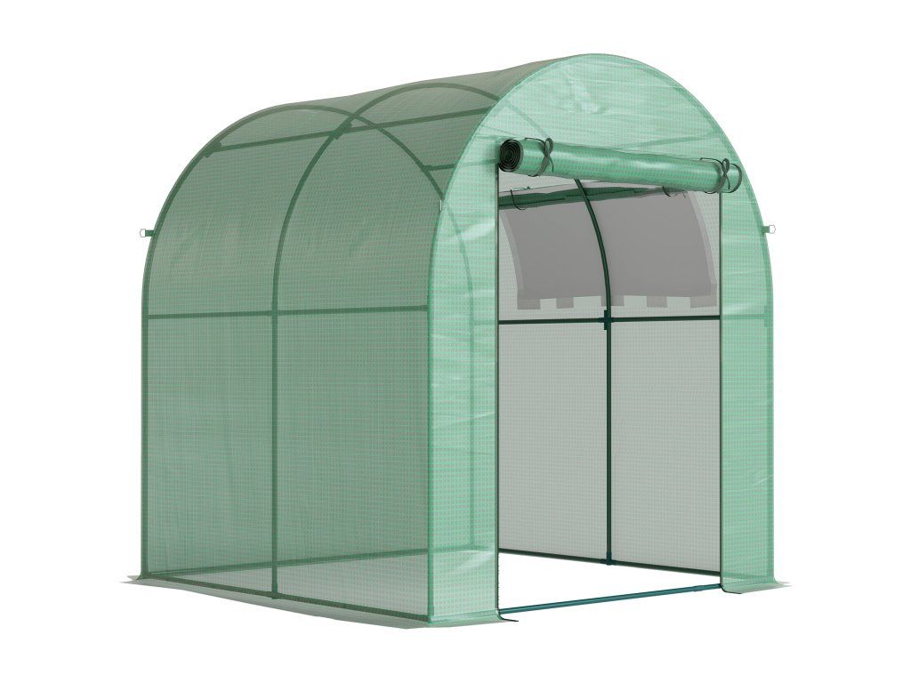 Rolovací dveře a okna: Snadný vstup a výstup ze skleníku a také větrání v případě potřeby. Dveře na zip pro větší bezpečnost.