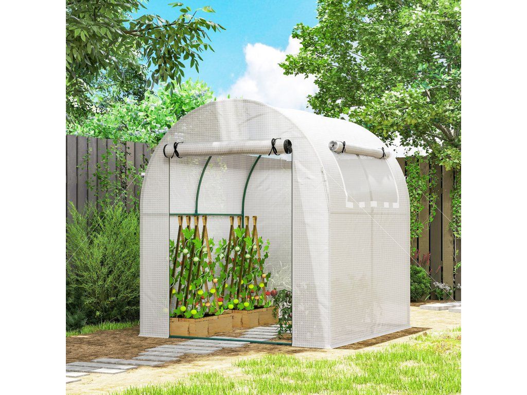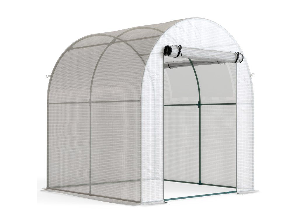 Rolovací dveře a okna: Snadný vstup a výstup ze skleníku a také větrání v případě potřeby. Dveře na zip pro větší bezpečnost.