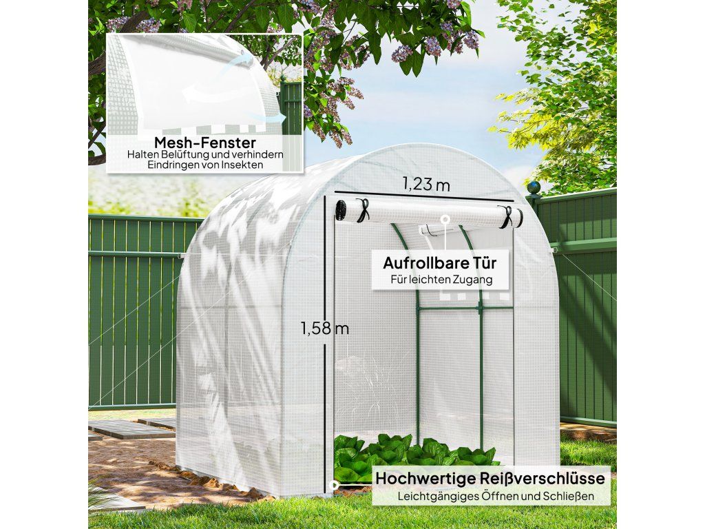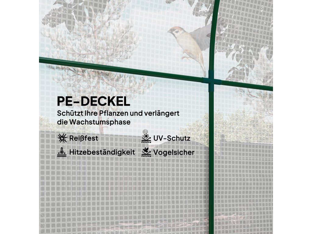 Dvouvrstvý plastový kryt: Tento skleník na rajčata poskytuje chráněný prostor, který chrání vaše rostliny před lehkými povětrnostními podmínkami, jako je vítr a déšť, a zároveň propouští 85 % slunečního světla. S 10cm přesahem pro zapuštění do země.