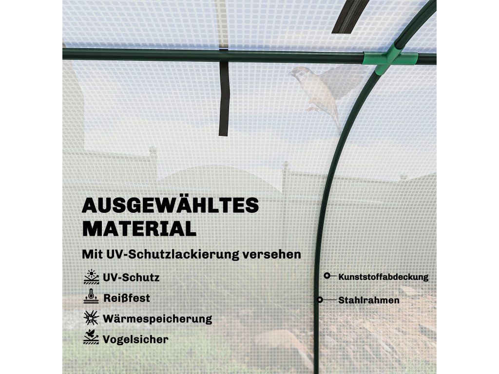Vysoká propustnost světla a stabilní konstrukce: PE kryt podporuje růst rostlin díky vynikající propustnosti světla. Robustní, větru odolný rám poskytuje vašim rostlinám v polytunelu světlé a stabilní prostředí.