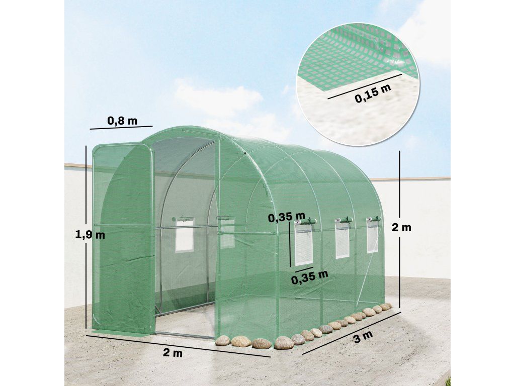 Celoroční zahradničení s dostatkem prostoru a ochranou díky polystyrenovému skleníku o rozměrech 2 x 3 m. Dveře s výklopnými dveřmi a rolovací síťovaná okna zajišťují čerstvý vzduch a snadný přístup. Plastový kryt o gramáži 140 g/m² chrání před nepříznivým počasím a zároveň umožňuje pronikání slunečního záření pro optimální růst. 15 cm přesahující okraje polystyrenového skleníku poskytují při zapuštění do země větší stabilitu.