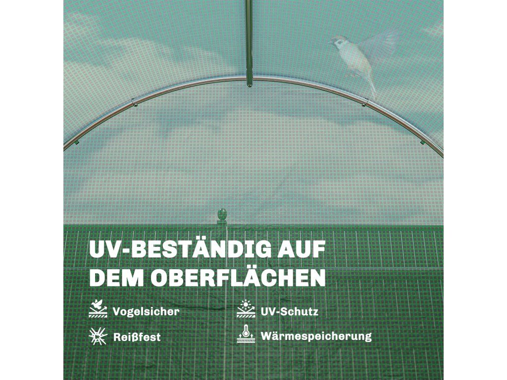 Ocelový rám: Pozinkovaný pro maximální odolnost a stabilitu. Součástí balení jsou šikmé výztuhy, čtyři zemní kotvy a čtyři kotvicí lana, které poskytují tomuto průchozímu skleníku dodatečnou stabilitu.