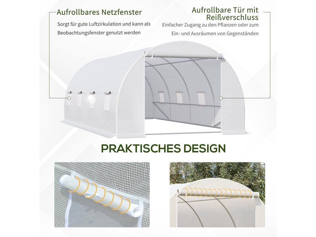 ROLOVACÍ DVEŘE: Velké rolovací dveře na zip poskytují snadný přístup a lze je nahoře zamknout, aby zůstaly otevřené. Skleník snadno stabilizujete pomocí 4 kolíků, 4 podpěr a širokého okraje krytu, který je zakopán do země.