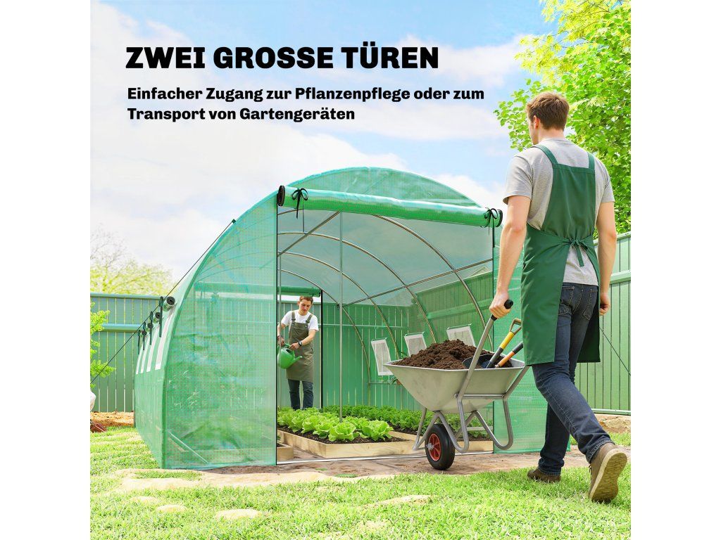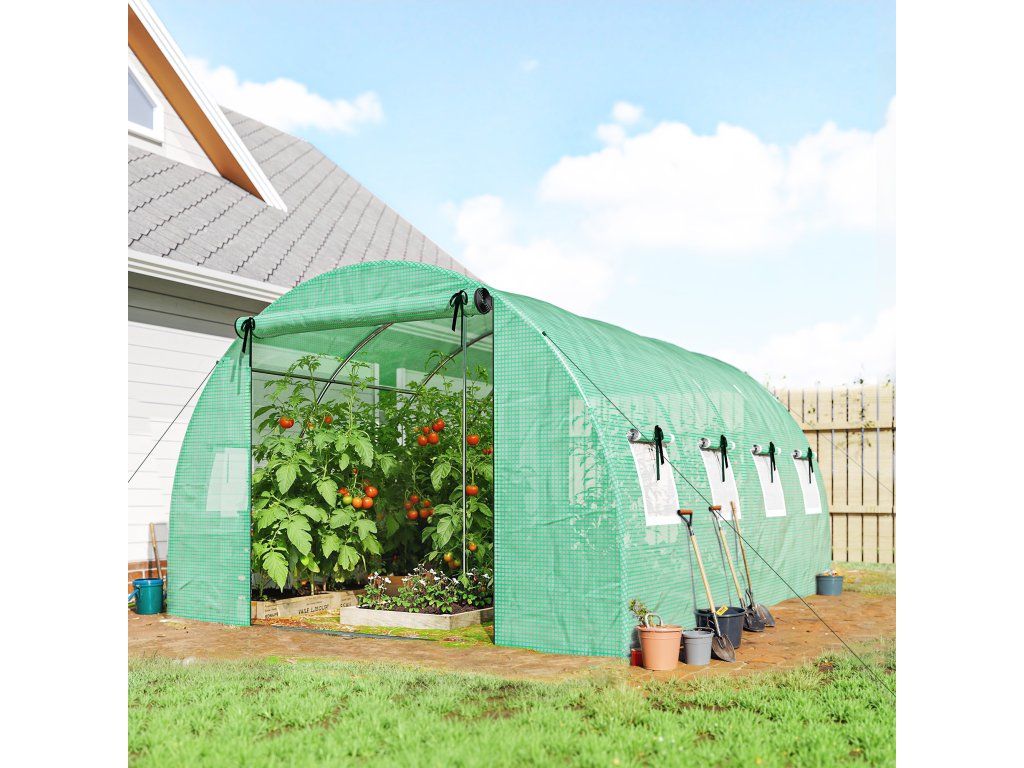 Praktický design: Polytunel se dvěma rolovacími dveřmi pro snadný přístup a přepravu zahradního nářadí. Osm síťovaných oken zajišťuje lepší větrání, zdravý vzduch pro rostliny a ochranu před nežádoucími návštěvníky.