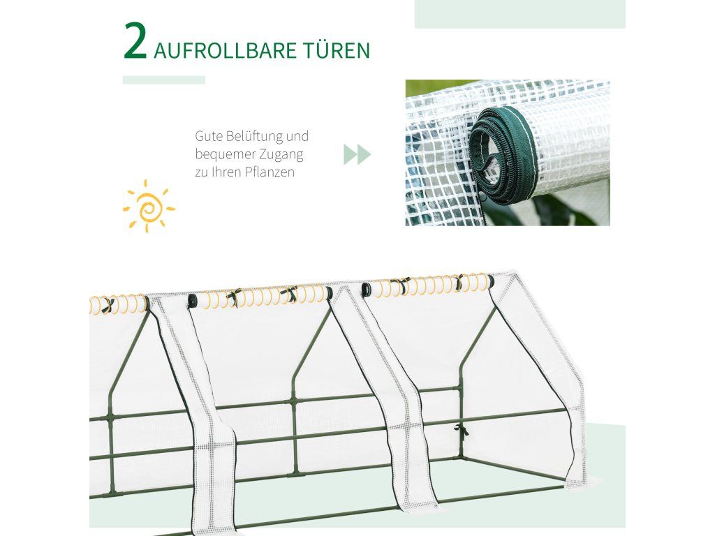 Praktický: Okna jsou rolovací a uzavíratelná zipem, takže vaše rostliny vždy dostávají dostatek světla a tepla a zároveň jsou chráněny před nepřízní počasí a zvířaty.