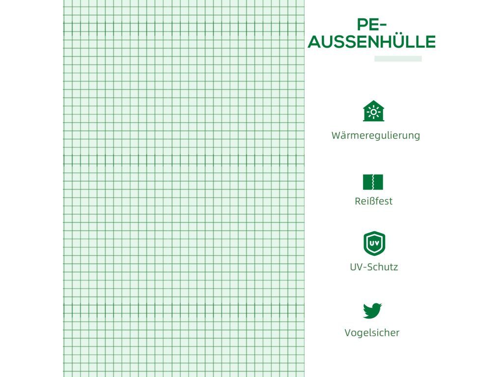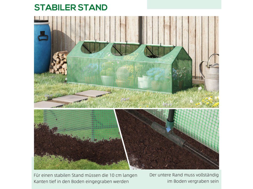 OCHRANNÝ KRYT: Plně uzavřený, vodotěsný a UV odolný kryt propouští silné sluneční světlo a zároveň v případě potřeby udržuje vysokou vlhkost. Prodloužené okraje o délce 10 cm jsou zapuštěny hluboko do země, aby dále stabilizovaly a napnuly kryt a zabránily hromadění vody.