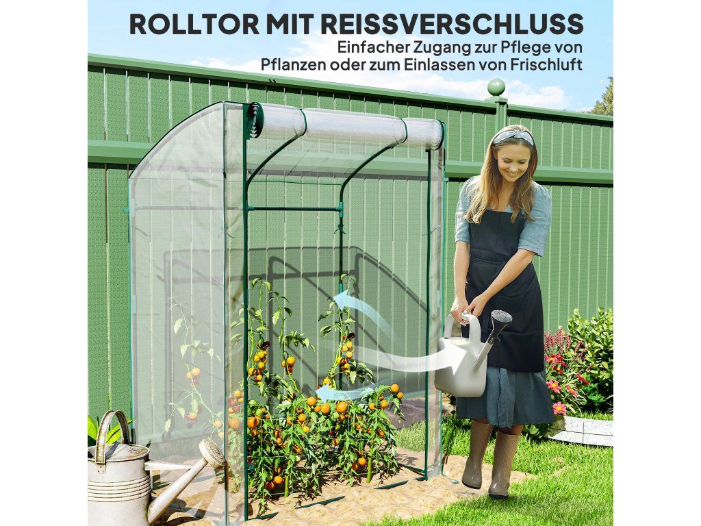 Pěstujte různé rostliny a zeleninu ve skleníku o rozměrech 128 x 70 cm. Rolovací dveře na zip chladicího rámu zajišťují snadný přístup a bezpečné uchycení. Robustní ocelový rám s ochranným plastovým krytem chrání před nepřízní počasí, jako je vítr, déšť a intenzivní sluneční záření. Součástí balení jsou zemní kotvy a lana pro bezpečné ukotvení.