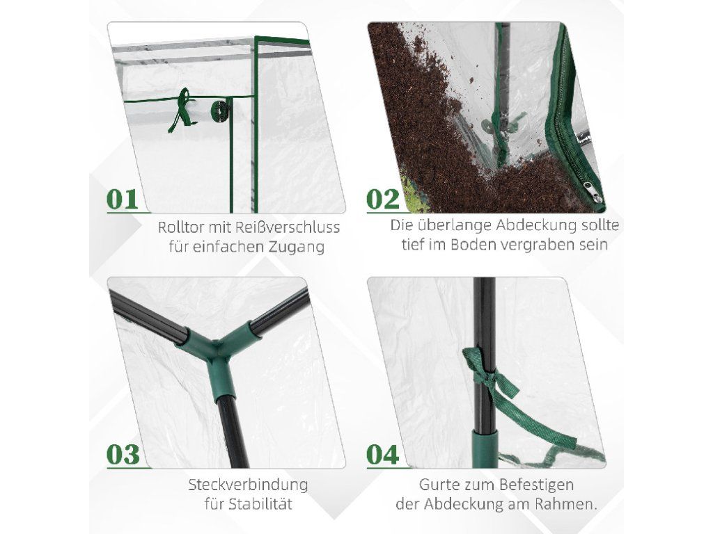 ODOLNÝ OCELOVÝ RÁM: Pozinkovaný ocelový rám skleníku na rajčata je odolný vůči rzi, korozi, odštípnutí a loupání. Součástí balení jsou popruhy pro bezpečné upevnění rámu a krytu.