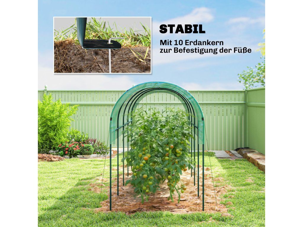 Stabilní konstrukce: Obsahuje čtyři robustní a nerezové ocelové oblouky. Klenutá horní část skleníku na rajčata umožňuje rychlé odtok dešťové vody a zabraňuje prohýbání krytu. Součástí balení je také osm zemních kolíků pro bezpečné ukotvení rámu k zemi.