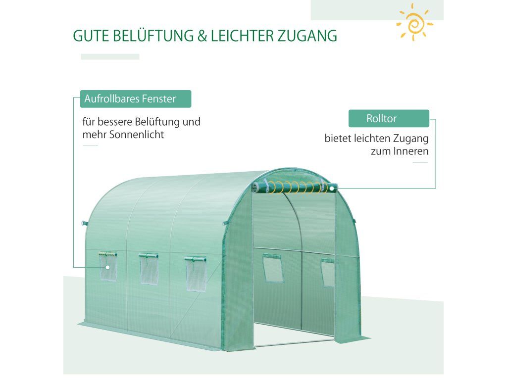 Rozkládací vstupní dveře: Velkoryse dimenzované rolovací fóliové dveře se zipem usnadňují přístup do skleníku a lze je nahoře zajistit tak, aby zůstaly trvale otevřené.