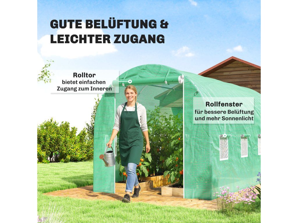 Rolovací přední vstup: Velké rolovací dveře se zipem, integrované do naší náhradní fólie pro skleníky, umožňují snadný přístup do interiéru a lze je pohodlně zajistit nahoře, aby zůstaly otevřené.