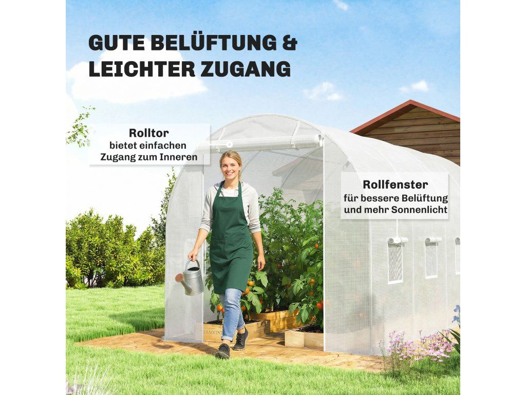 Rolovací přední vstup: Velké rolovací dveře se zipem, integrované do naší náhradní fólie pro skleníky, umožňují snadný přístup do interiéru a lze je pohodlně zajistit nahoře, aby zůstaly otevřené.