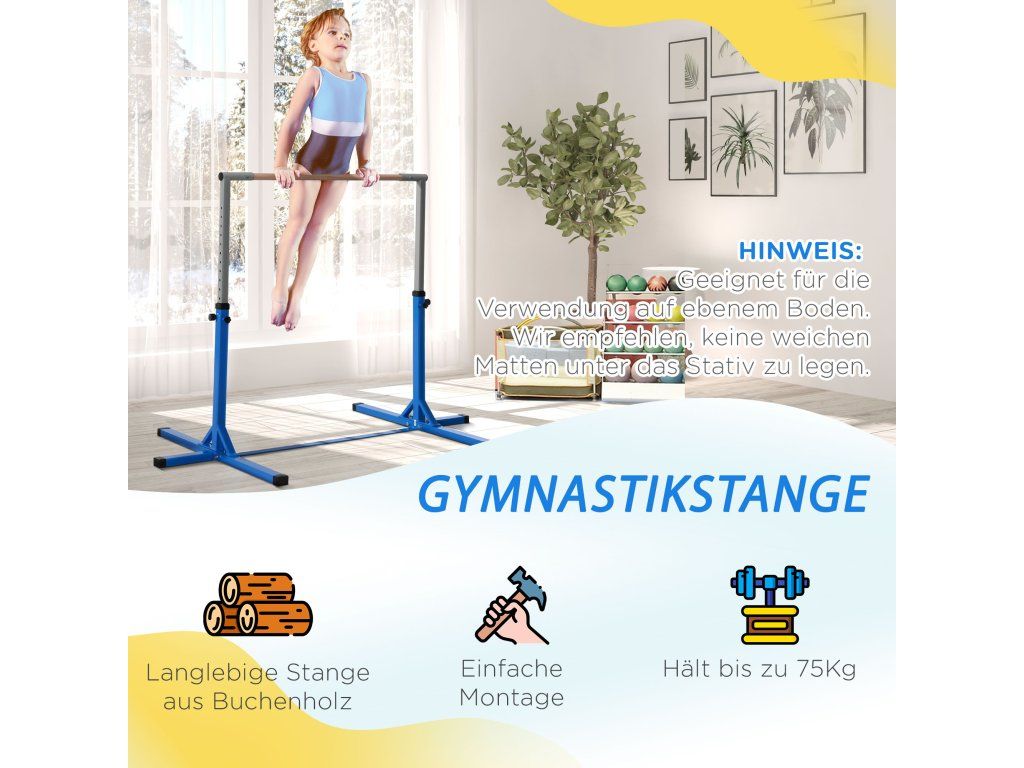 Odolná konstrukce, hladký pocit: Gymnastická hrazda je vyrobena z práškově lakované oceli pro dlouhou životnost a má bukovou tyč, která je příjemně hladká a netříští se – ideální pro citlivé dětské ručičky.