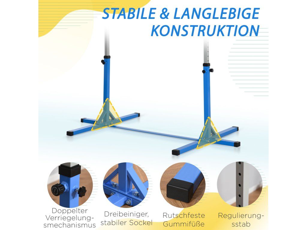 Trojúhelníková opora: Díky stabilní, široké, trojúhelníkové základně a zesíleným koncem ve tvaru T zajišťuje tato gymnastická hrazda stabilitu při každém pohybu a saltu. Pogumované rohy nejen zvyšují přilnavost, ale také chrání podlahu před poškrábáním.