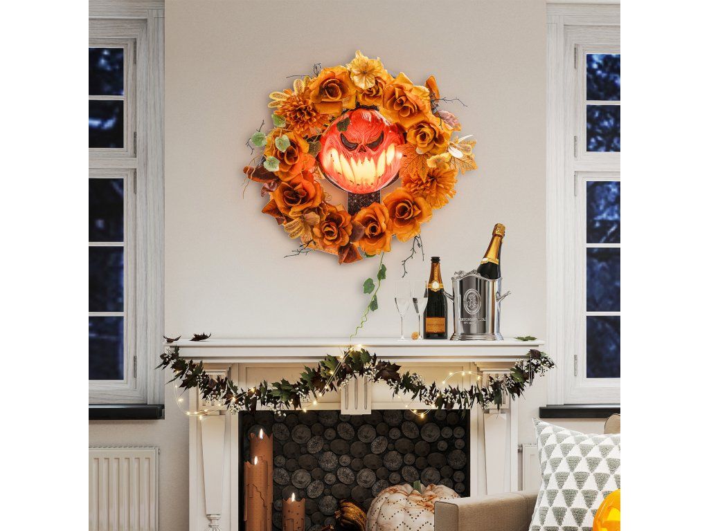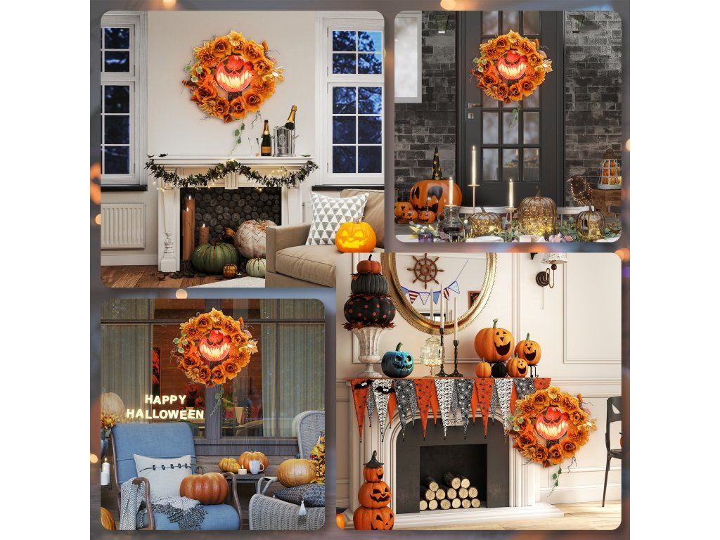 Všestranné dekorace: Umístěte tento dýňový věnec na vstupní dveře, abyste přivítali hosty, nad krbovou římsu pro útulnou, strašidelnou atmosféru nebo do okna, abyste potěšili návštěvníky na koledování – ideální pro šíření sváteční halloweenské nálady kdekoli.