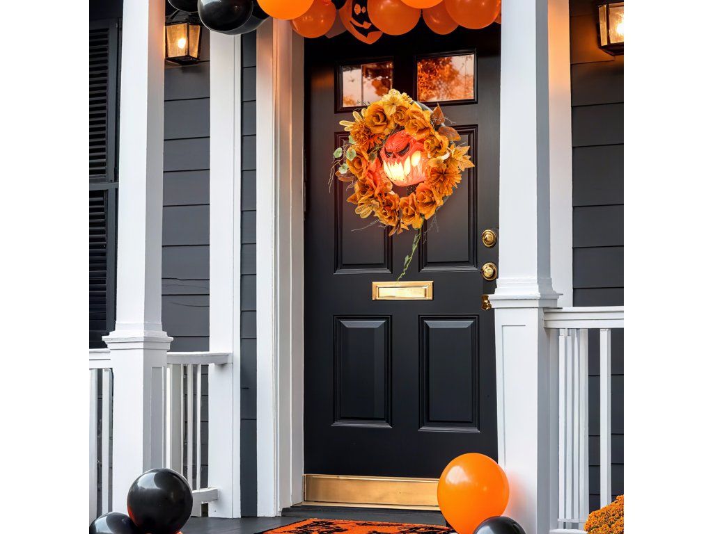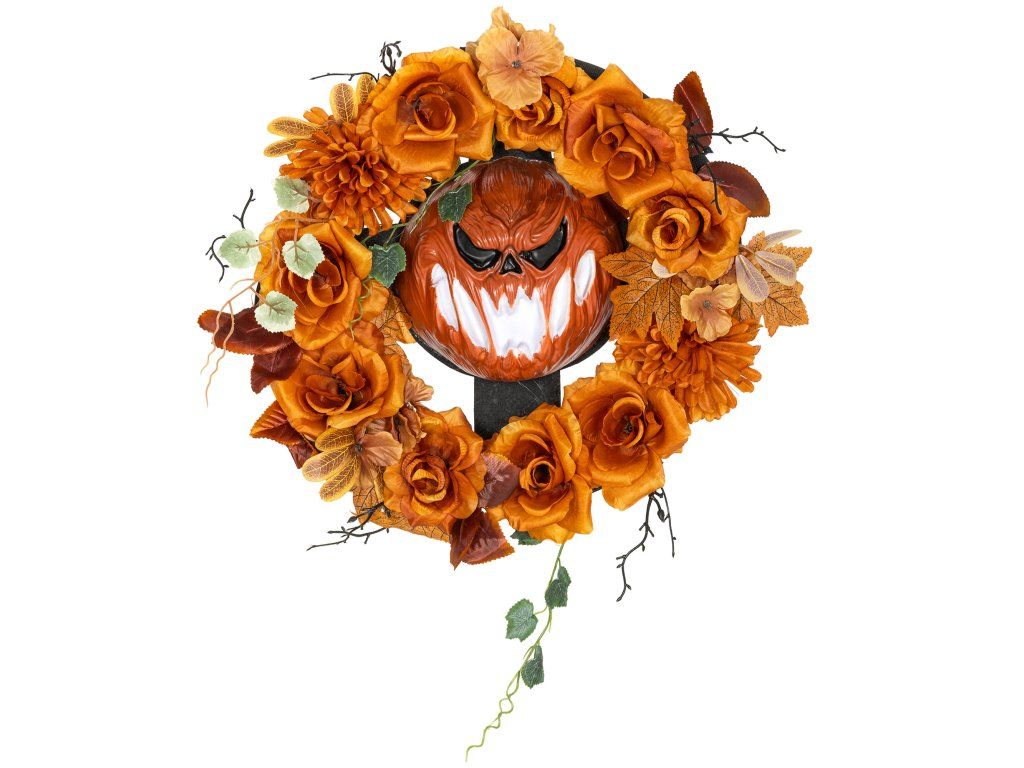Halloweenský závěsný věnec: Tento věnec s děsivým dýňovým obličejem obklopeným zářivě oranžovými květy a podzimním listím dodává výrazný, strašidelný nádech a vytváří strašidelnou atmosféru. Halloweenská atmosféra.