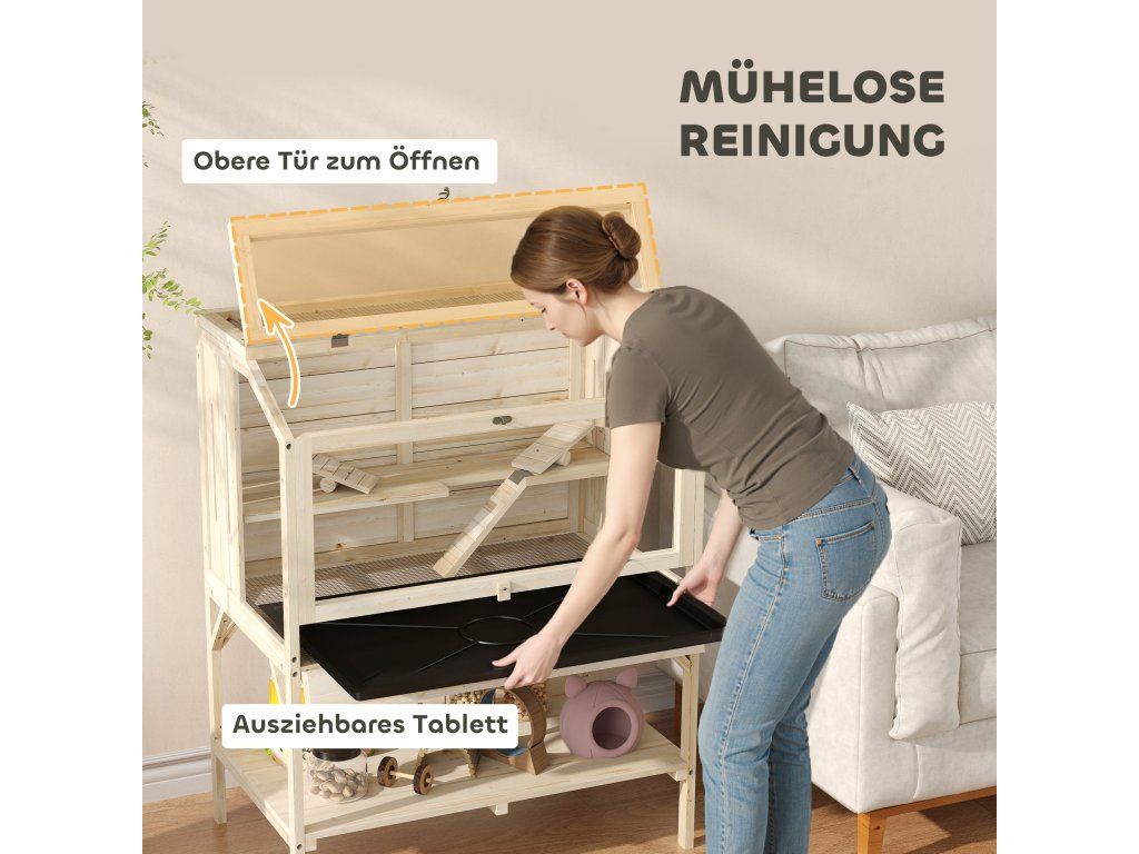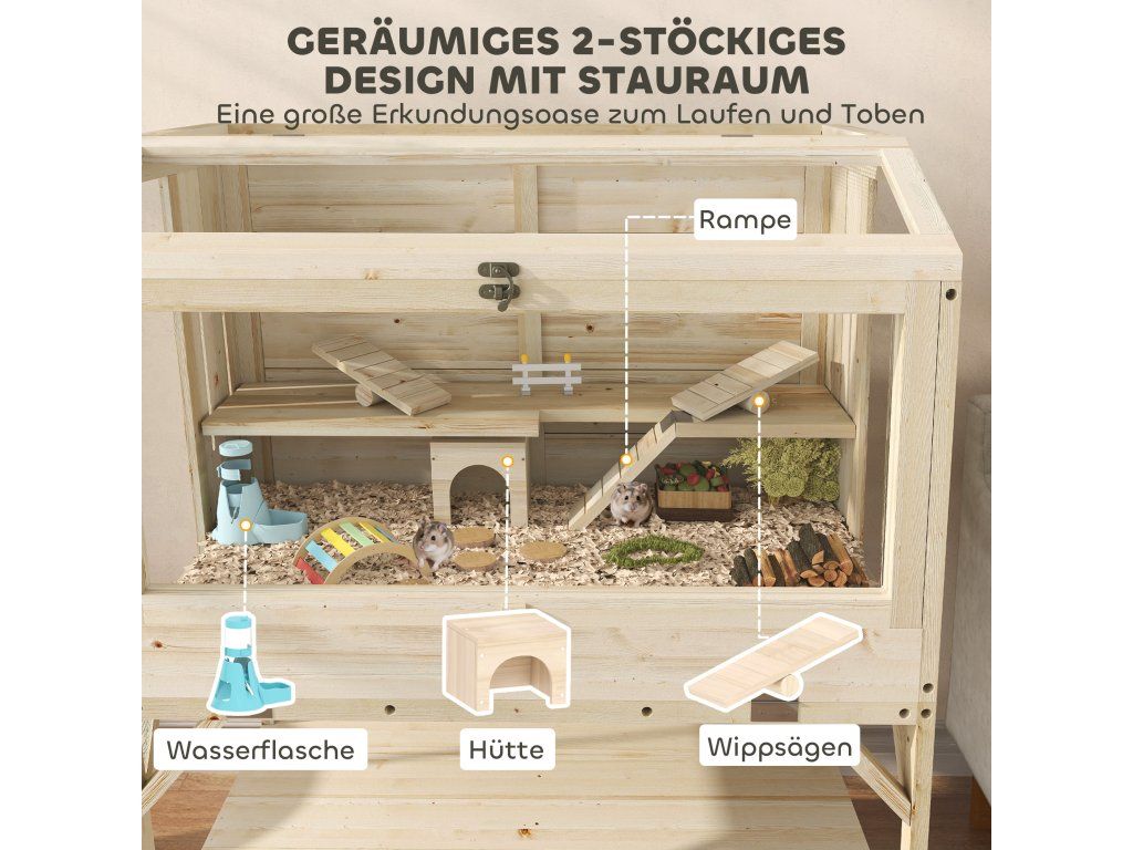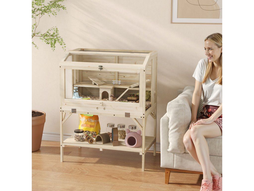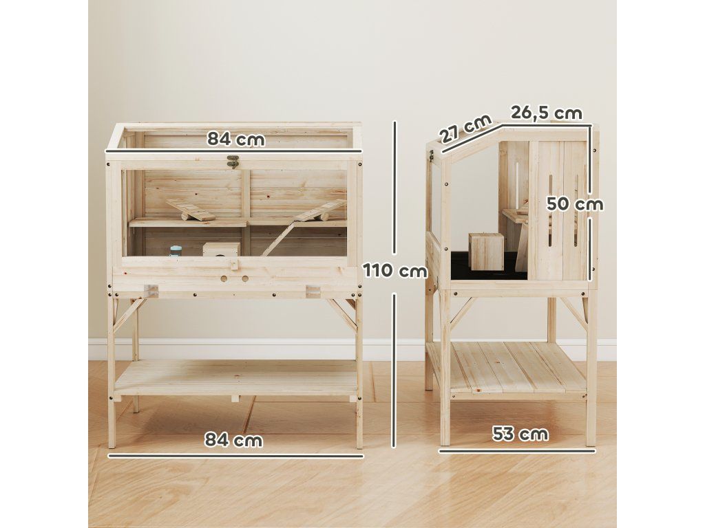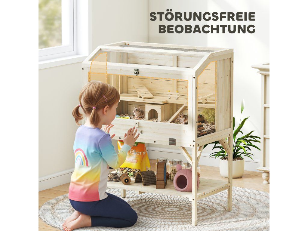 Vaši malí mazlíčci mohou lézt, hrát si v útulných úkrytech a užívat si přiložené houpačky a rampy. Průhledné PET panely a boční ventilace zaručují dobrou viditelnost a čerstvé proudění vzduchu, zatímco robustní rám z jedlového dřeva s protiskluzovými nožičkami zajišťuje stabilitu. Spodní přihrádka poskytuje další úložný prostor, díky čemuž je tato klec bezpečným a praktickým prostředím pro křečky, pískomily a syrské křečky.