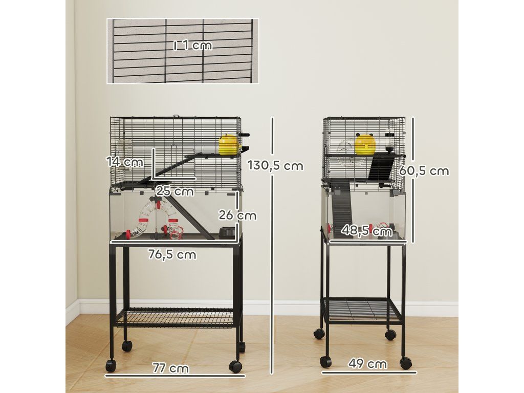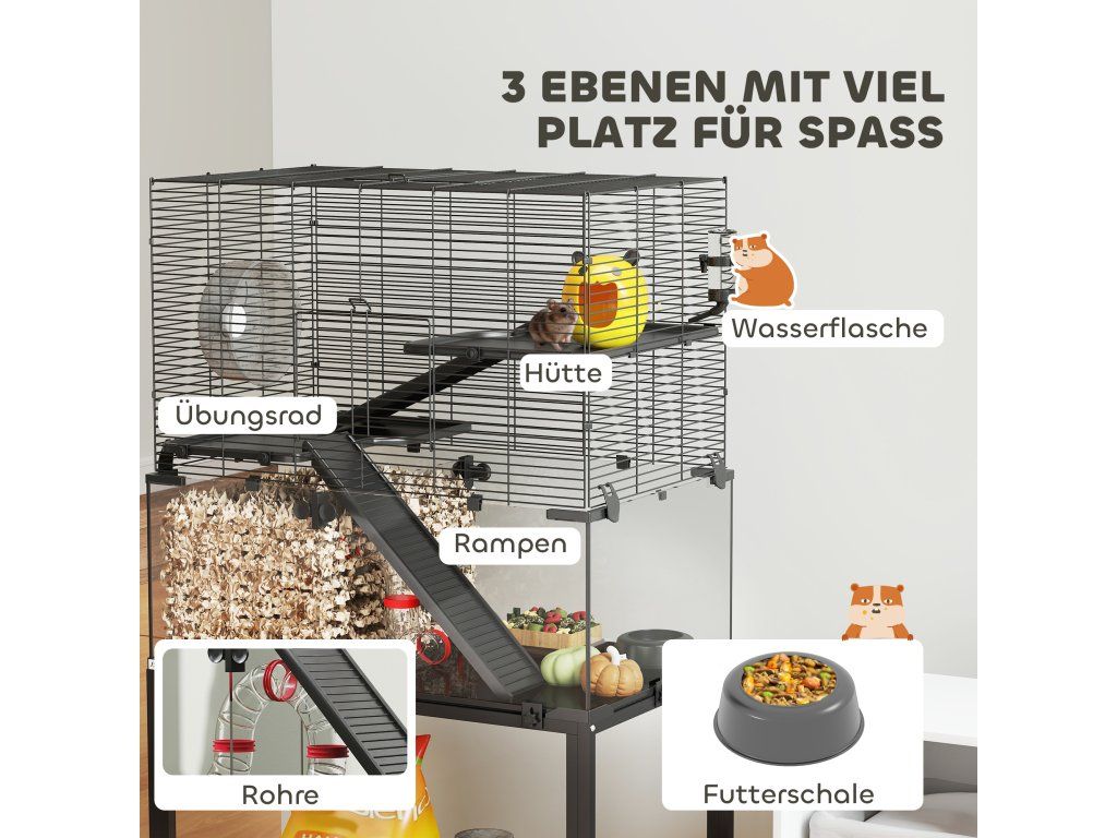 Víceúrovňová zábava: Tato tříúrovňová klec pro křečka (77 x 49 x 130,5 cm) nabízí stimulující prostředí s tunely, rampami, běžeckým kolem, miskou na krmivo, láhví na vodu a útulným úkrytem, kde si váš křeček může hrát, šplhat, a objevujte nová dobrodružství.