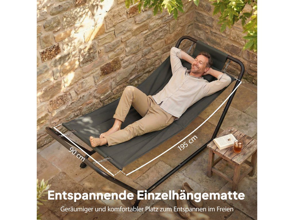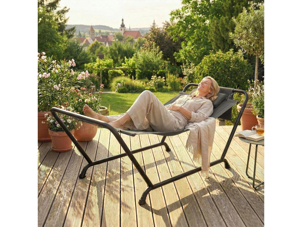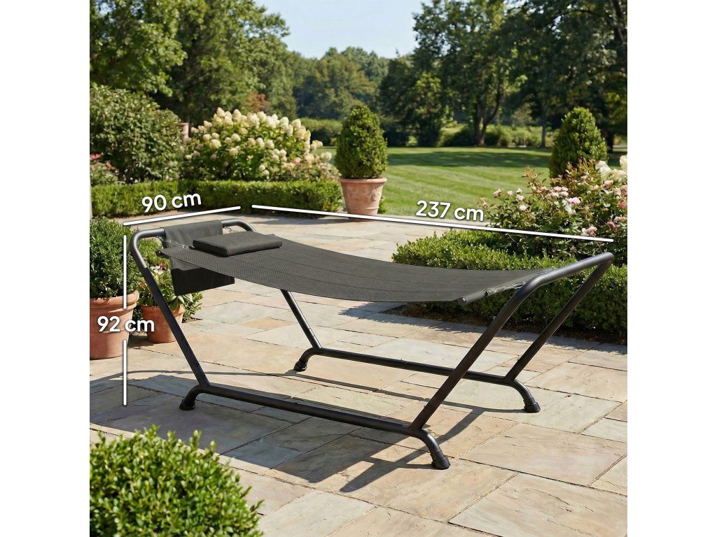Vestavěná kapsa na časopisy: Boční kapsa na knihy, časopisy nebo telefon – vše na dosah ruky pro dokonalou relaxaci. Strávte relaxační odpoledne v této volně stojící houpací síti.