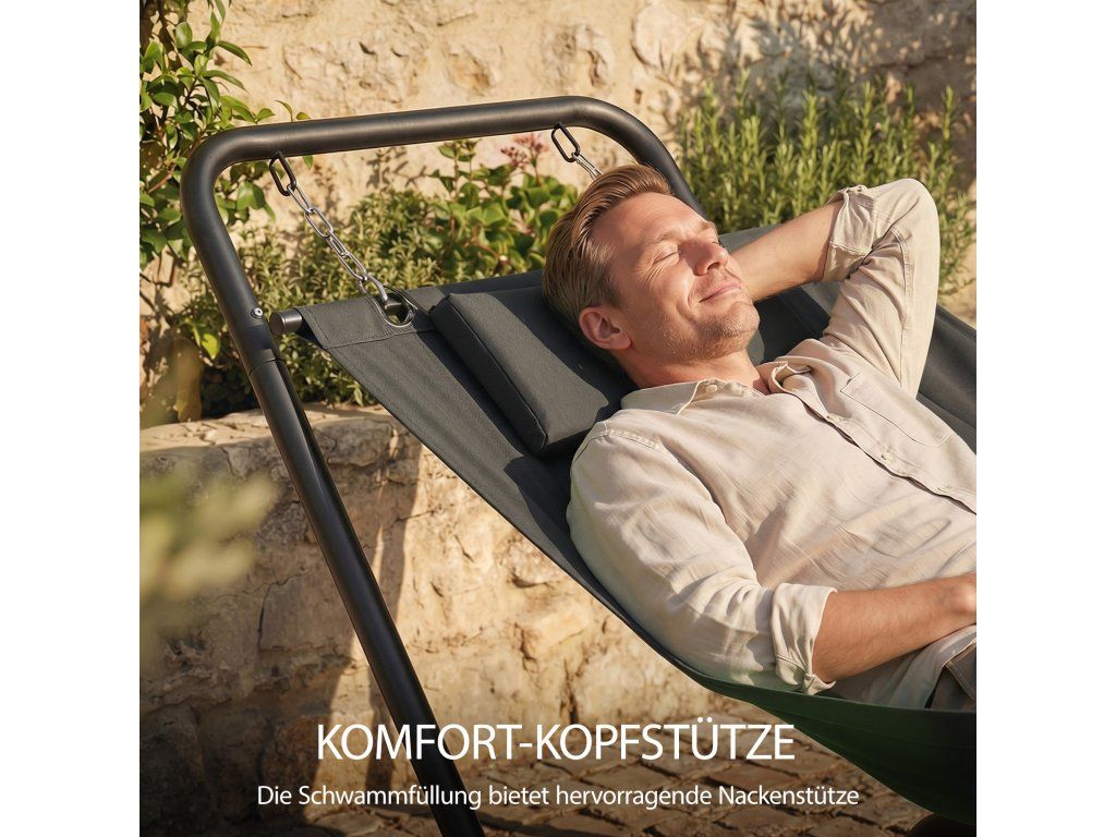 Exkluzivní pohodlná opěrka hlavy: Naše houpací síť je vybavena opěrkou hlavy vyplněnou pěnou pro optimální oporu krku a zvýšené pohodlí při čtení nebo spaní, na rozdíl od jednodušších modelů se stojanem.
