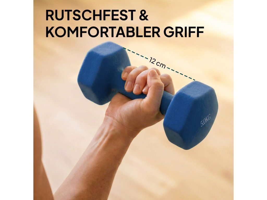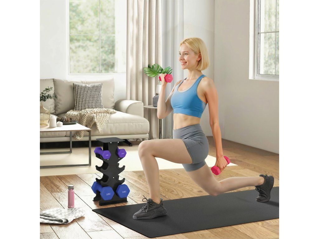 Přidejte rozmanitost do své fitness rutiny a zaměřte se na budování svalů. Sada činek obsahuje dvě ruční závaží o hmotnosti 5 kg, dvě 3 kg a dvě 1 kg a stojan na činky. Díky šestihrannému tvaru se činky neodkutálejí. Protiskluzové rukojeti zajišťují bezpečnost, plastový povlak chrání podlahu - ideální pro cvičení doma. Každý kout se stává tělocvičnou!