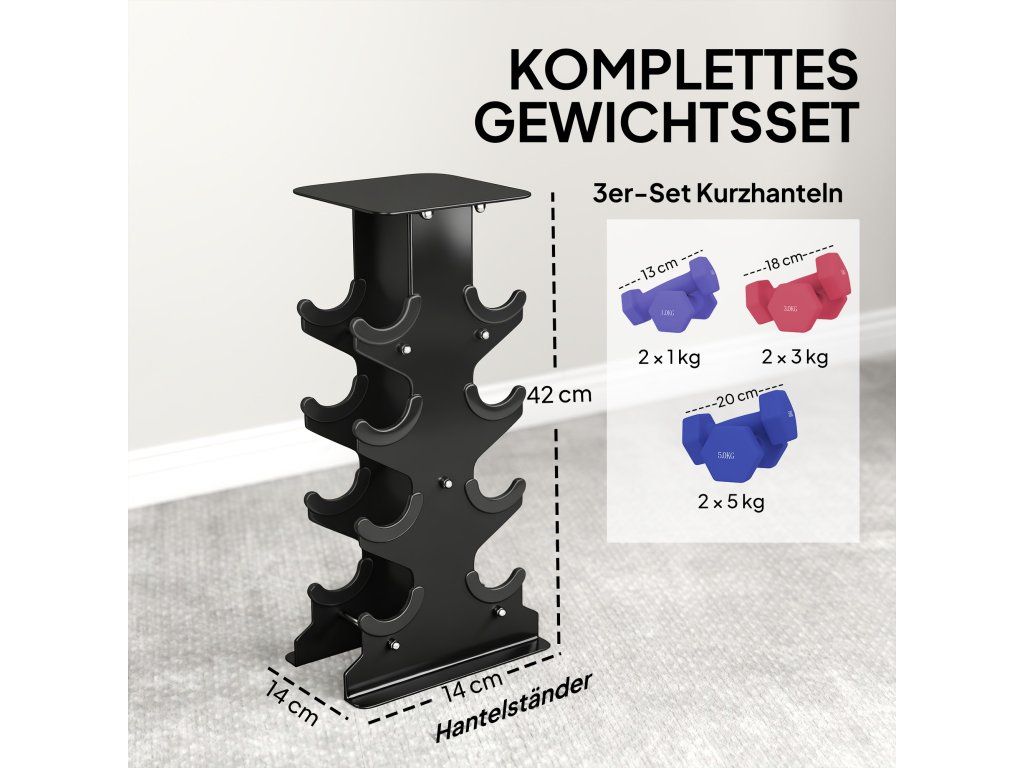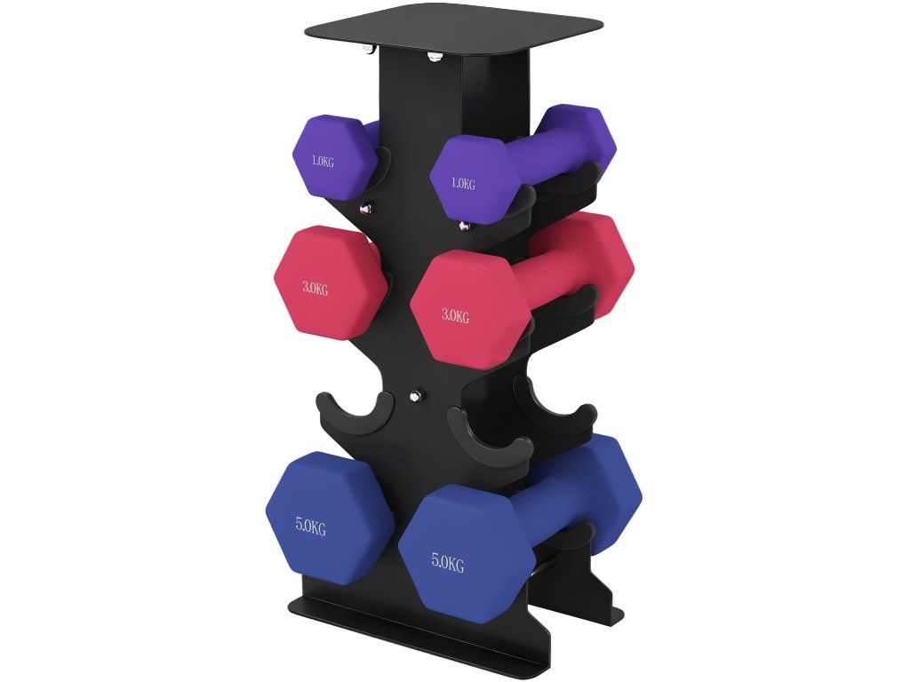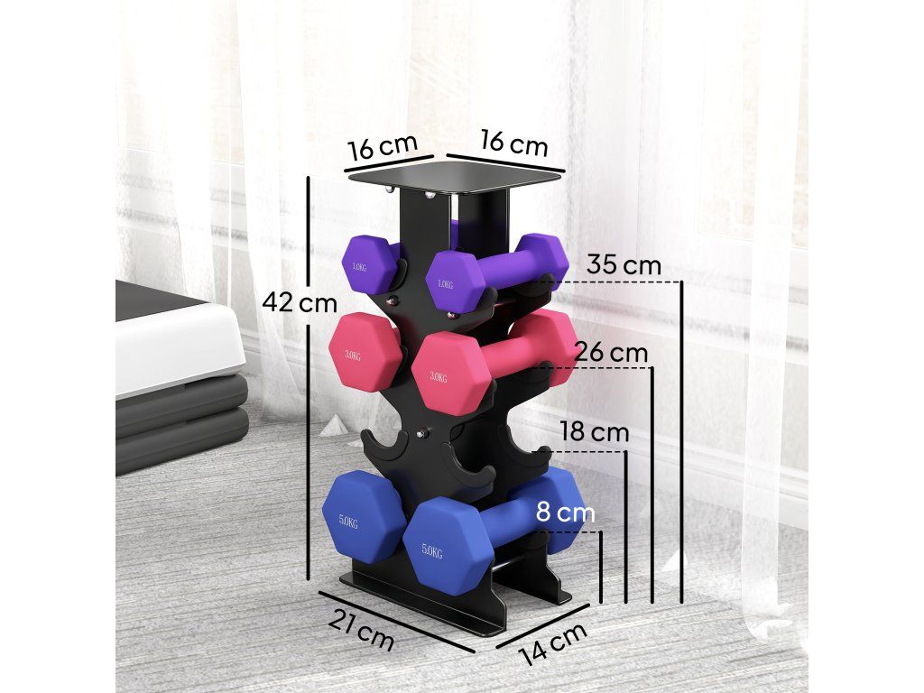 Kompletní sada závaží: Obsahuje sadu činky se šesti závažími (1, 3, 5 kg) a stojan pro snadné skladování. Praktický úložný prostor pro rychlé uložení mezi tréninkovými sadami.