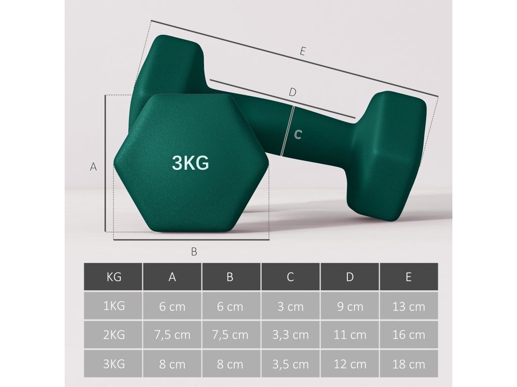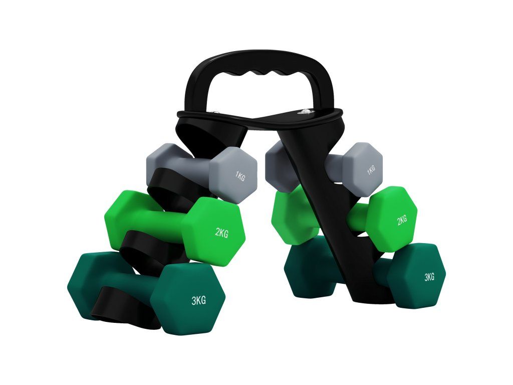 ✔ Kompletní sada šestihranných činek: 2 x 1 kg, 2 x 2 kg, 2 x 3 kg.