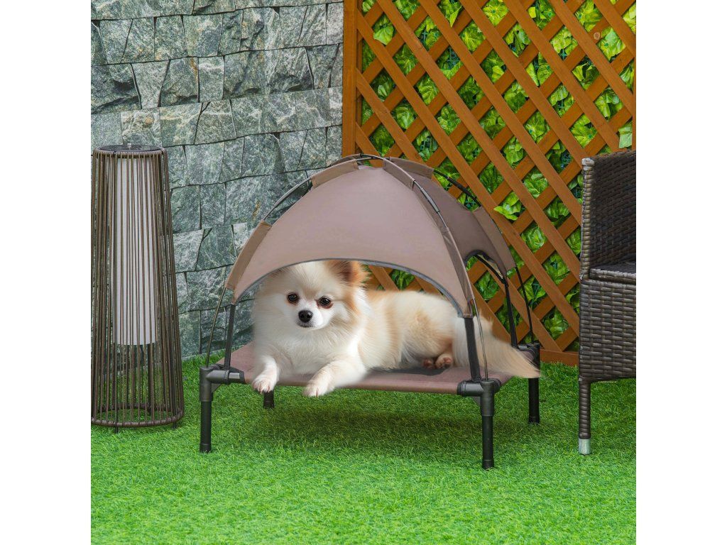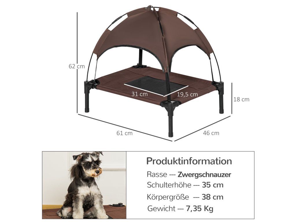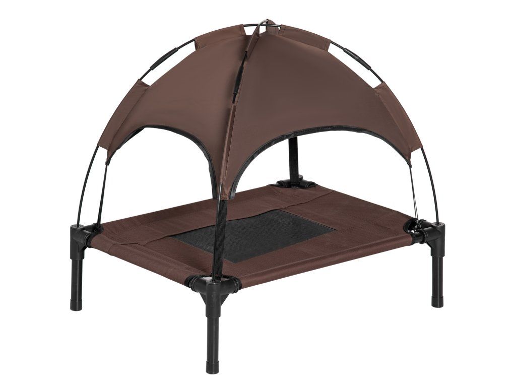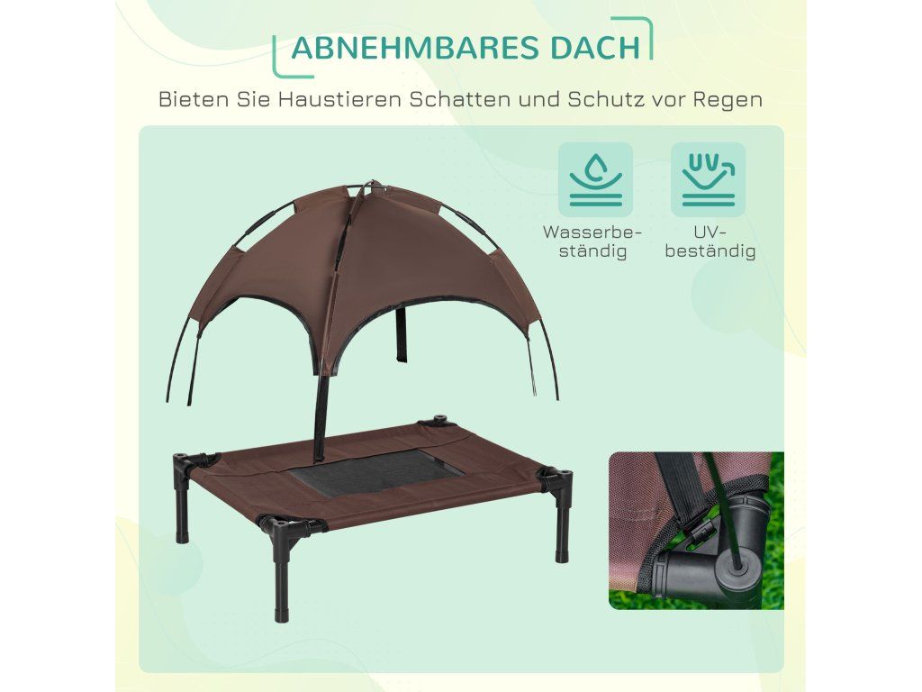 Dopřejte svému mazlíčkovi dokonalou relaxaci s naším stylovým pelíškem! Tento vyvýšený psí pelíšek je podepřen čtyřmi kovovými trubkami s práškovým nástřikem, kolem kterých je omotaná prodyšná síťovina. Stříška poskytuje vašemu mazlíčkovi příjemný stín i v létě a lze ji snadno nastavit. Robustní konstrukce zabraňuje kymácení a převrácení, takže váš chlupatý kamarád může klidně spát.
