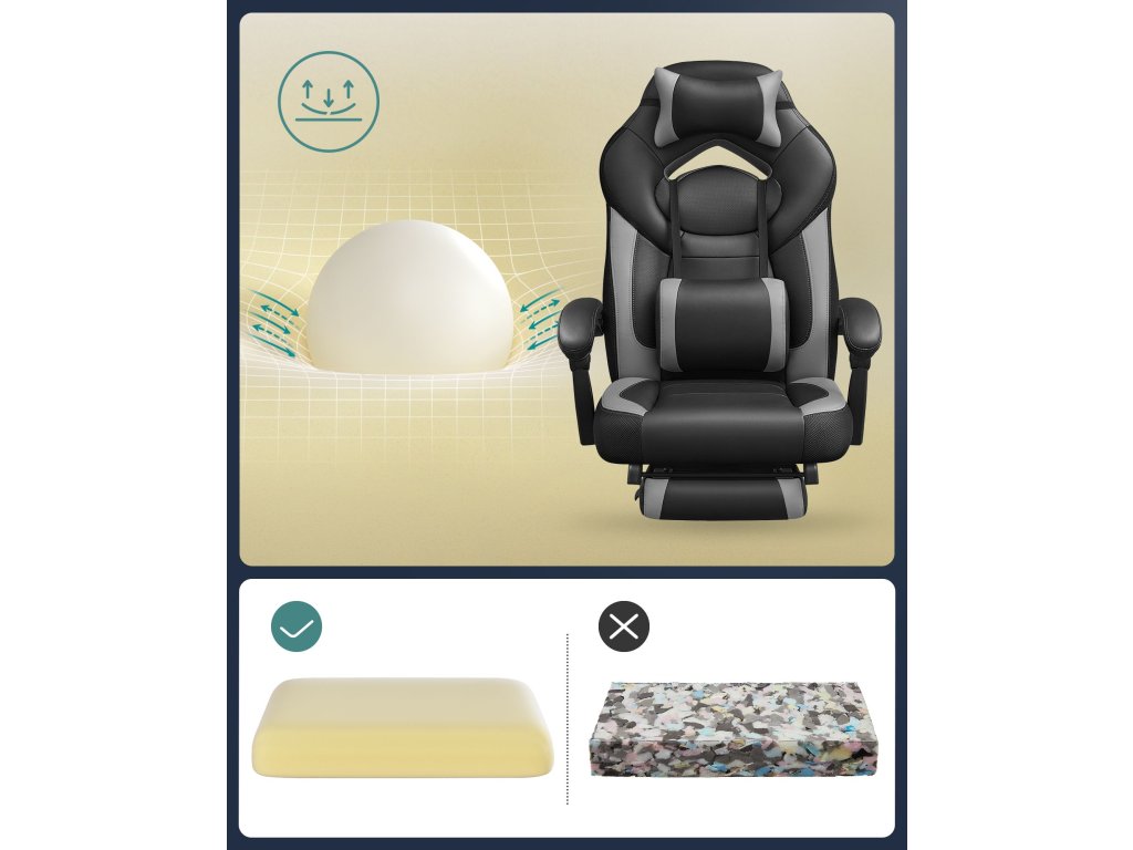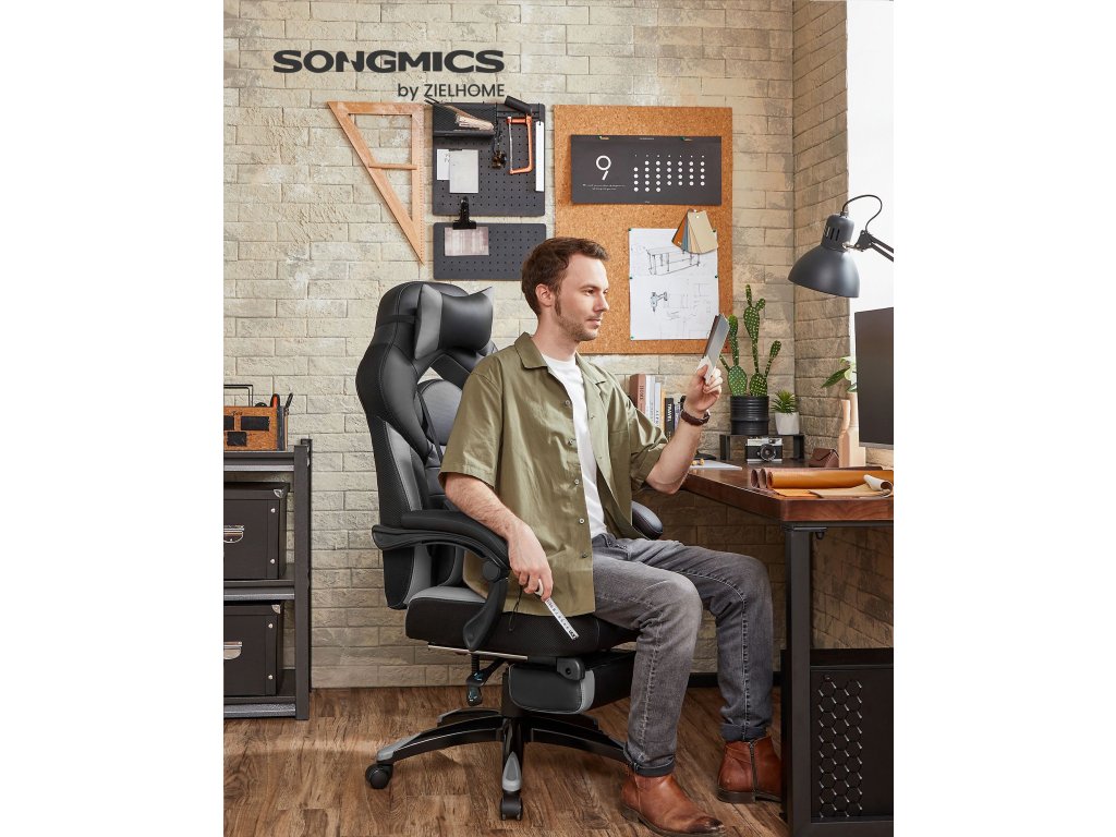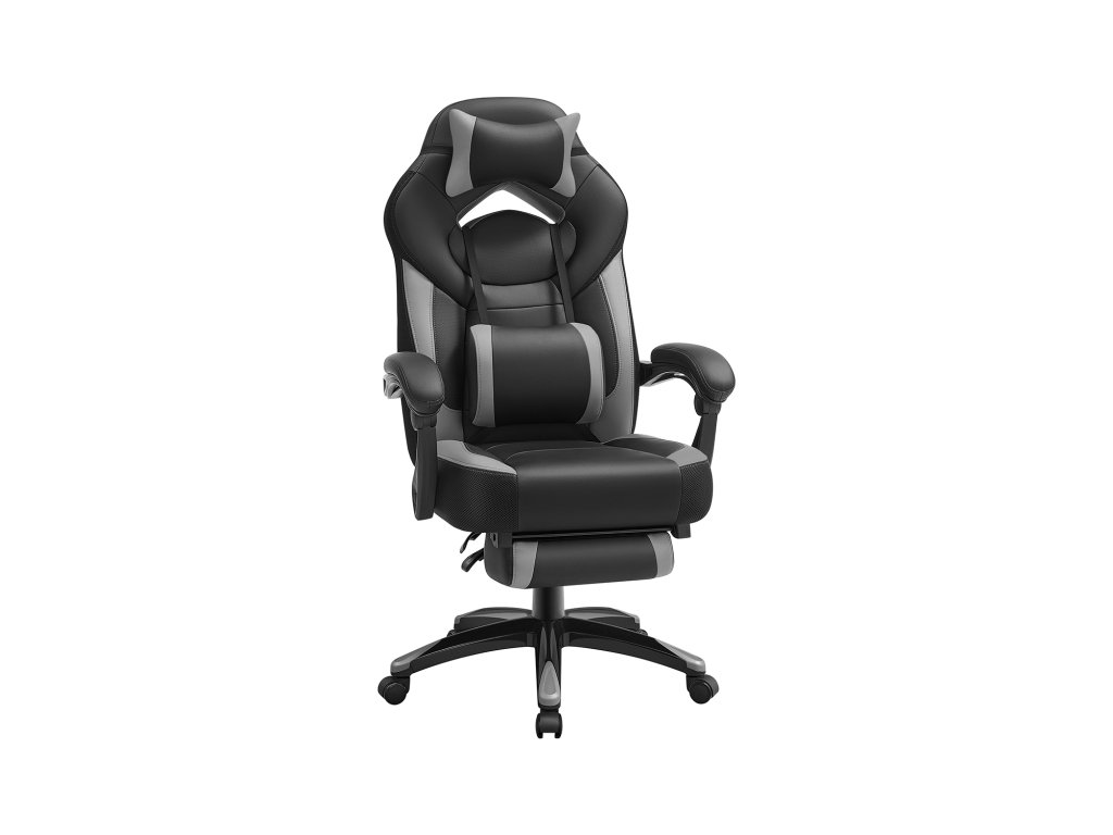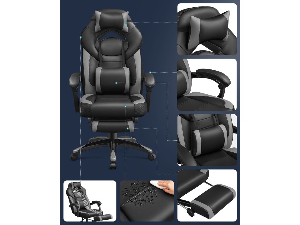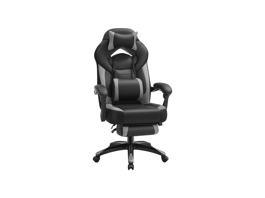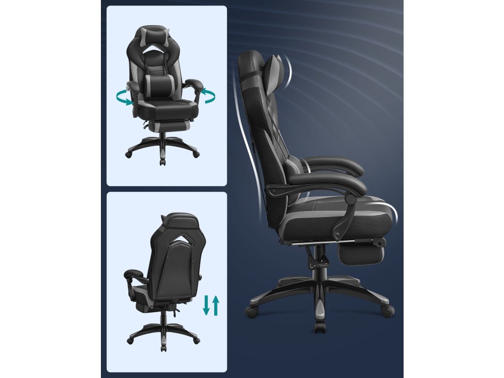 Herní závodní židle s podnožkou, ergonomický design, nastavitelná opěrka hlavy, bederní opěrka, nosnost 150 kg, černošedá.