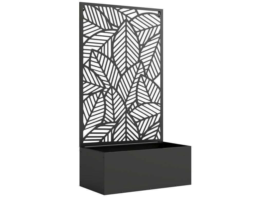 Dekorativní a funkční zástěna na ochranu soukromí: Kovový květináč je vybaven umělecky navrženou zástěnou na ochranu soukromí s výřezy na listy, která poskytuje soukromí a slouží jako treláž pro Popínavé rostliny.