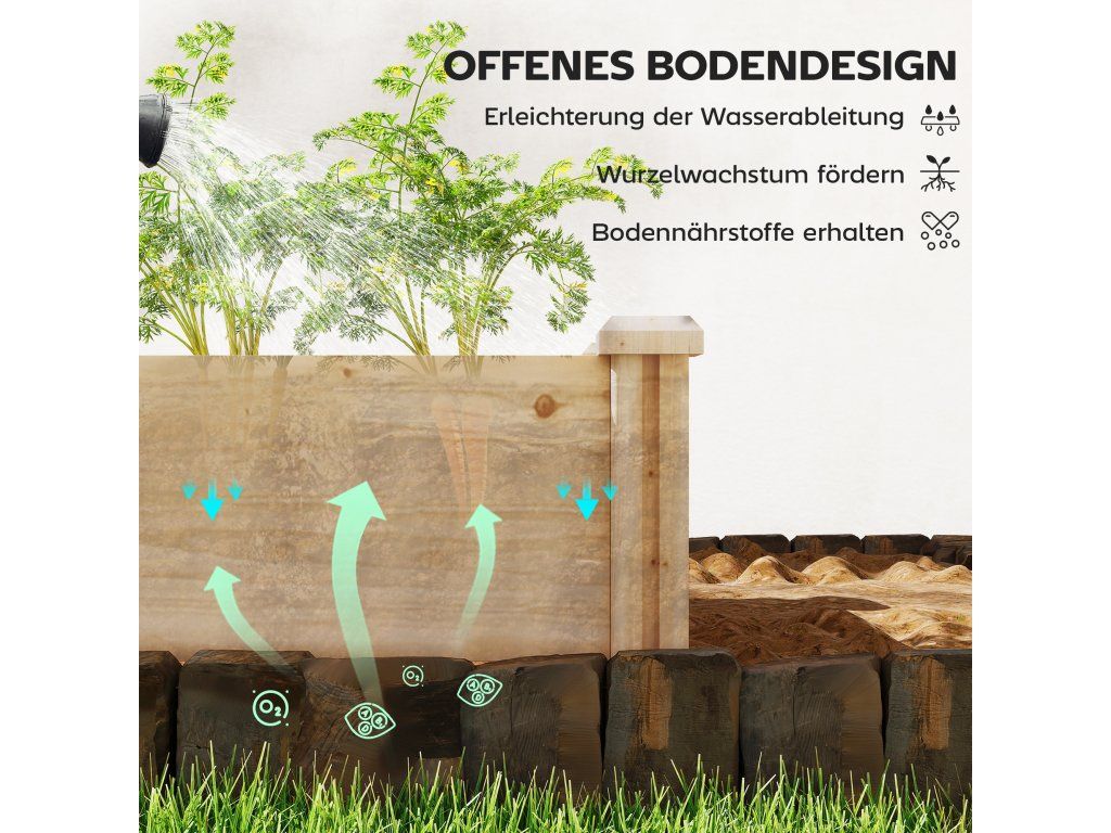 Otevřené dno: Otevřené dno zajišťuje optimální odvodnění – žádné další problémy s zamokřením! Tento dřevěný vyvýšený záhon zaručuje, že vaše rostliny dostanou potřebné živiny a vláhu pro zdravý a silný růst kořenů.