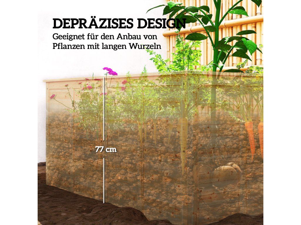 Vyvýšený design 77 cm: Zvýšená výška snižuje ohýbání a namáhání zad při zahradničení, což usnadňuje sázení, zalévání a sklizeň. Chrání také rostliny před malými živočichy a poskytuje hlubší vrstvu půdy, ideální pro hluboce zakořeněné rostliny.