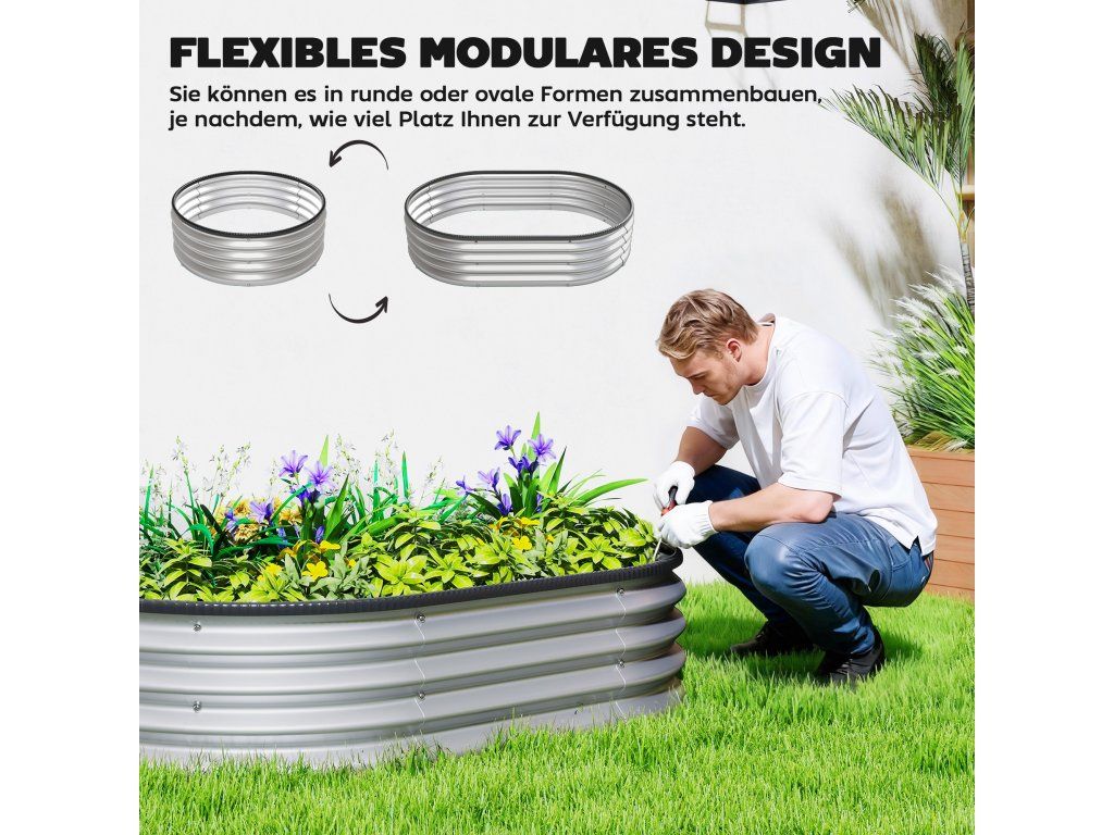 Flexibilní modulární design: Náš kovový vyvýšený záhon se vyznačuje modulárním designem, který lze přizpůsobit kulatému nebo oválnému tvaru. Hladký okraj s gumovými proužky zvyšuje bezpečnost; při montáži se doporučují rukavice.
