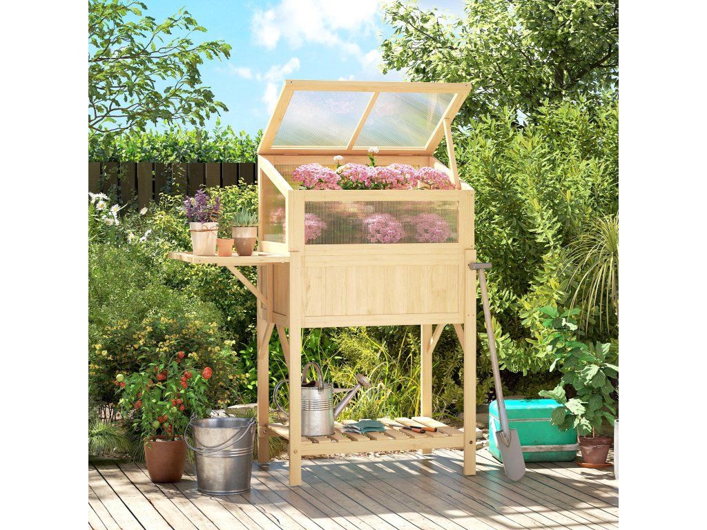 Integrovaná pracovní stanice: Vyvýšený záhon se skládacím bočním stolkem pro přesazování a spodní policí na zeminu a nářadí. Impregnovaná masivní dřevěná konstrukce, odolná a ideální pro efektivní zahradničení.
