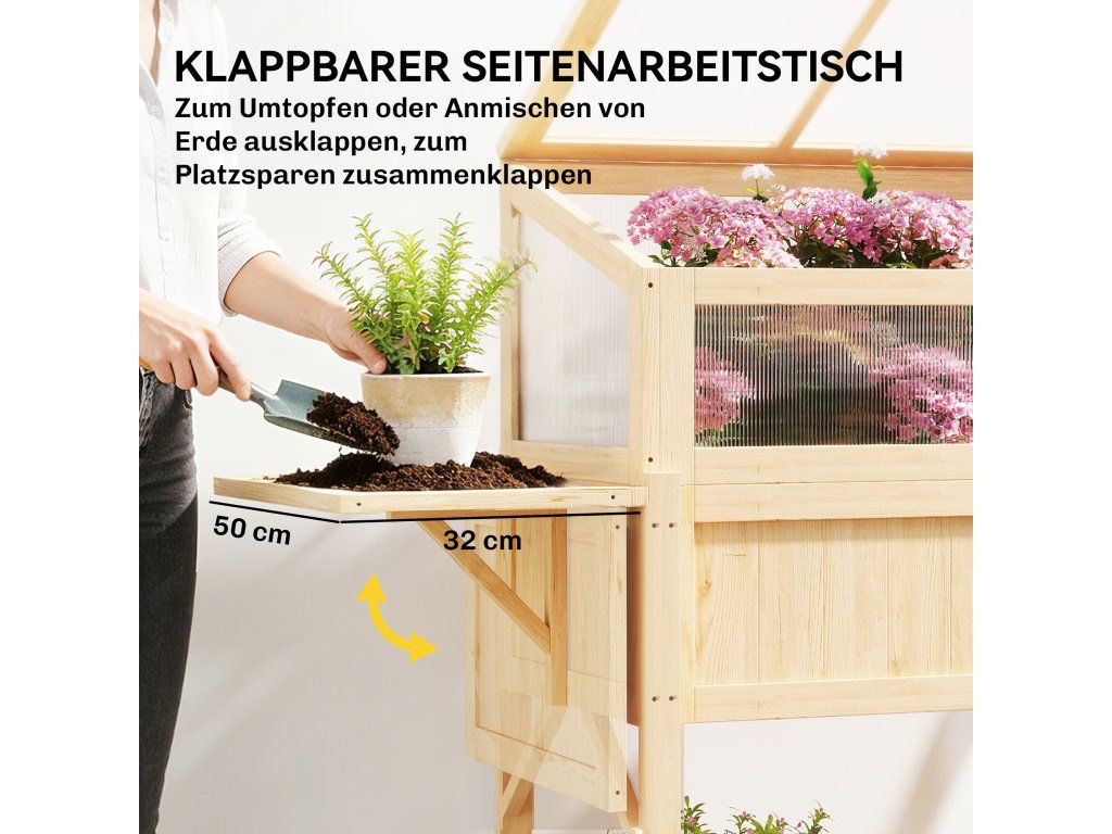 ✔ Výklopná boční police pro snadné přesazování a výměnu půdy.