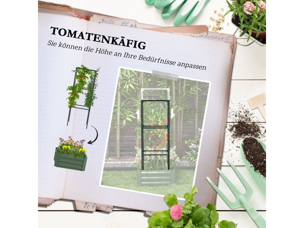 Ať už se jedná o vinnou révu nebo popínavé rostliny, mřížoví na rajčata a přiložený vyvýšený záhon na balkony pomohou každé popínavé rostlině dosáhnout jejího plného potenciálu. Díky nastavitelnému designu klece lze připevnit rostliny jakékoli velikosti a tvaru. Pozdvihněte své rostliny nad plevel a divoká zvířata. Otevřená základna vyvýšeného bylinkového záhonu zabraňuje přemokření a umožňuje kořenům obzvláště dobrý růst.