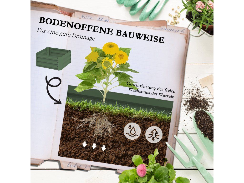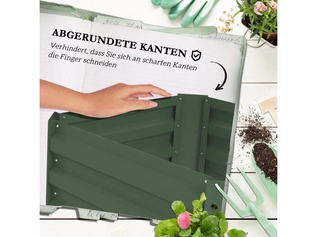 Robustní konstrukce: Na rozdíl od dřeva, které se může deformovat, je náš pozinkovaný vyvýšený záhon vyroben z pozinkované a práškově lakované oceli, což jsou materiály odolné vůči vodě a povětrnostním vlivům a snesou extrémní venkovní podmínky.