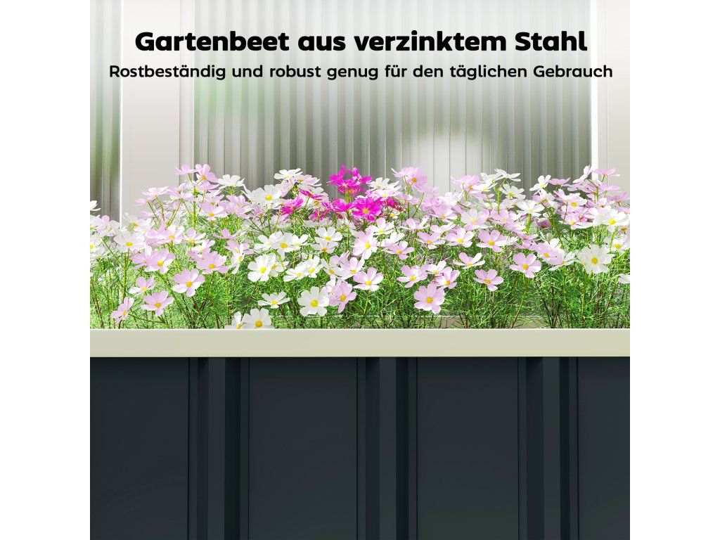 Pozinkovaný ocelový rám: Vyrobeno z pozinkované oceli s práškovým nástřikem, tato kovová vyvýšená postel je zvláště odolná proti korozi a deformacím. Snadno odolává slunci, dešti i sněhu a zajišťuje dlouhou životnost.