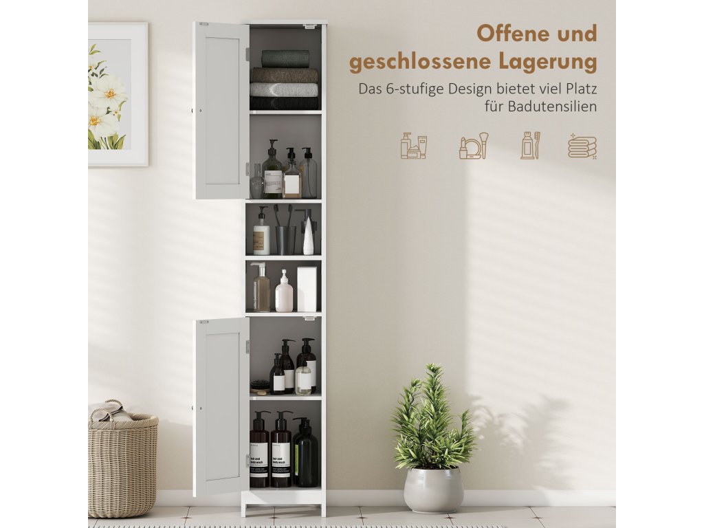 Otevřený a uzavřený úložný prostor: Tato vysoká koupelnová skříňka kombinuje dvě dvoupatrové skříňky pro skryté uložení se dvěma otevřenými přihrádkami, ideální pro každodenní nezbytnosti, ručníky a toaletní potřeby uspořádané a snadno dostupné.