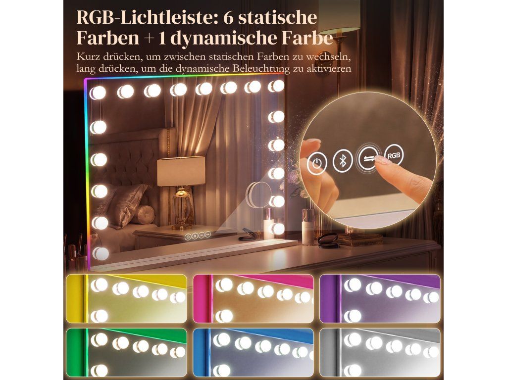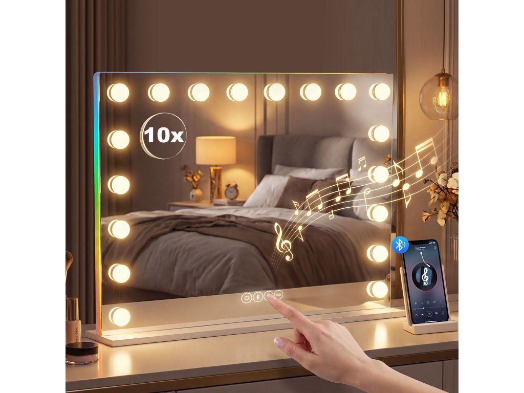 Hudba a RGB světlo: Připojte telefon přes Bluetooth a přehrávejte hudbu, zatímco RGB proužek svítí v 7 režimech. Základna kosmetického zrcátka bezpečně drží telefon pro hands-free použití.
