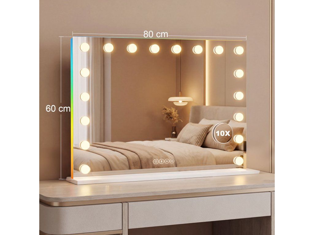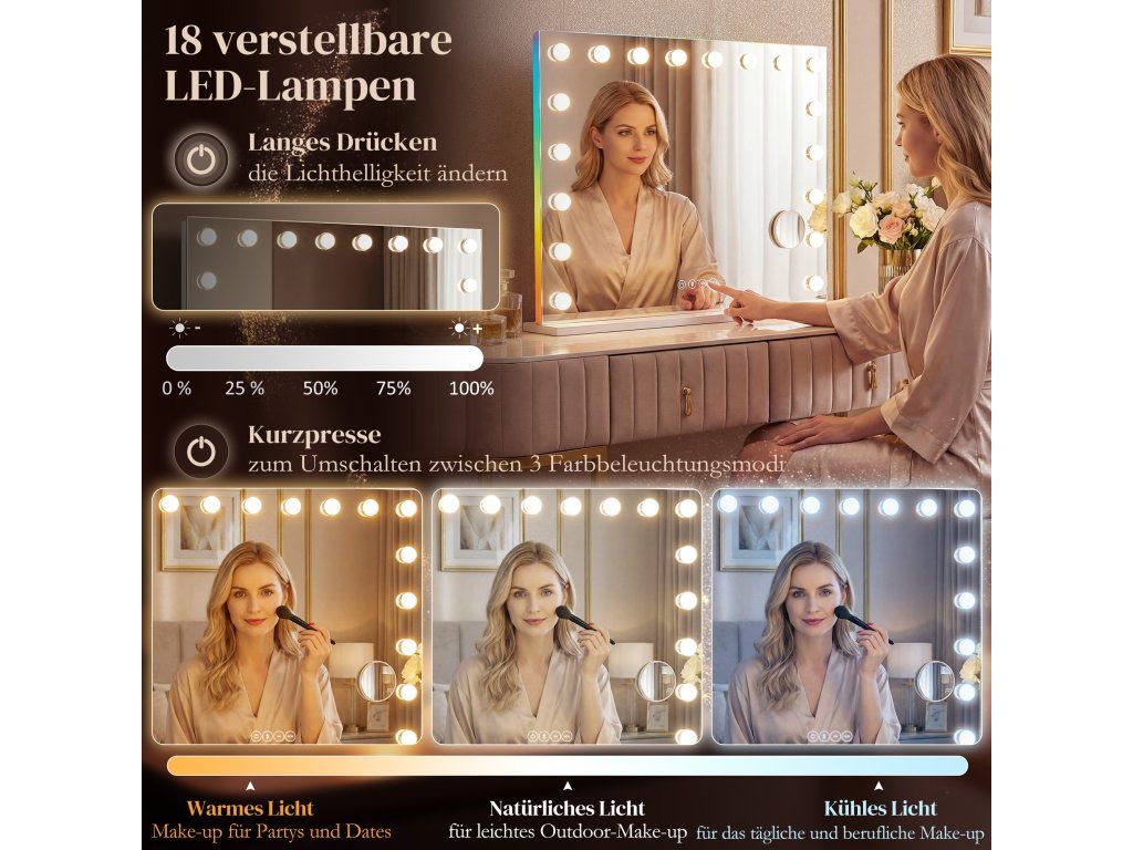 ✔ Hollywoodské zrcadlo s 18 LED diodami nabízí 3 barevné režimy (teplý/přirozený/studený) s nastavitelným jasem.