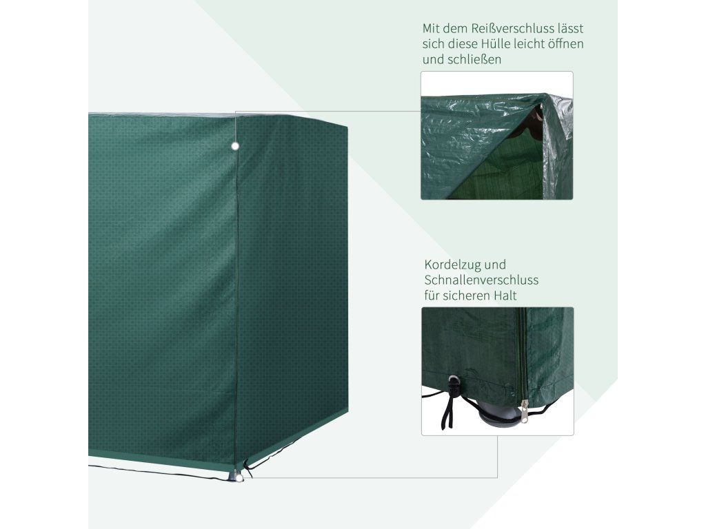 Odolný kryt: V decentní tmavě zelené barvě chrání kryt XL váš zahradní nábytek, grily, přívěsy za kola a dokonce i verandové houpačky před povětrnostními vlivy a nečistotami.