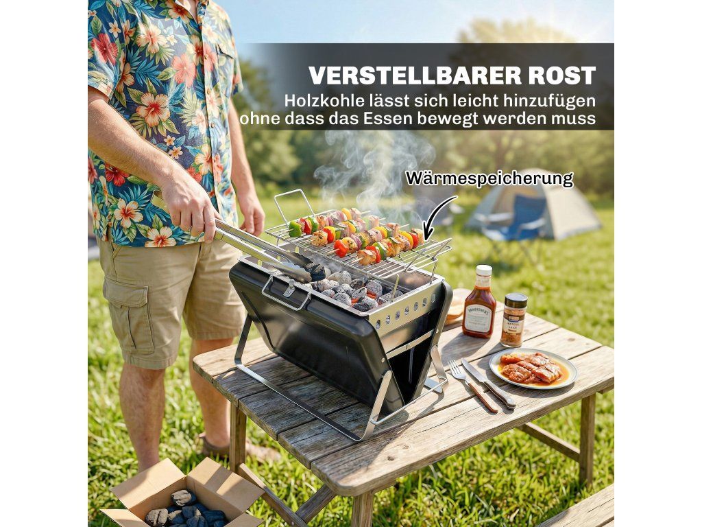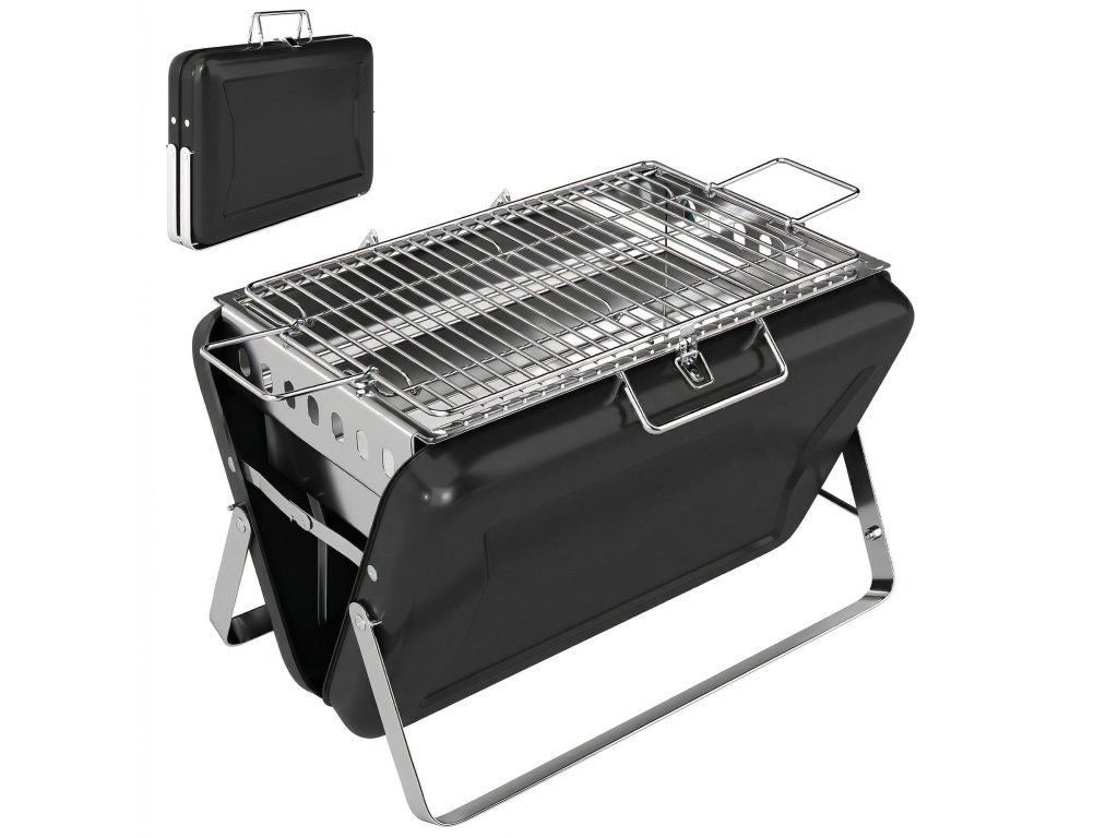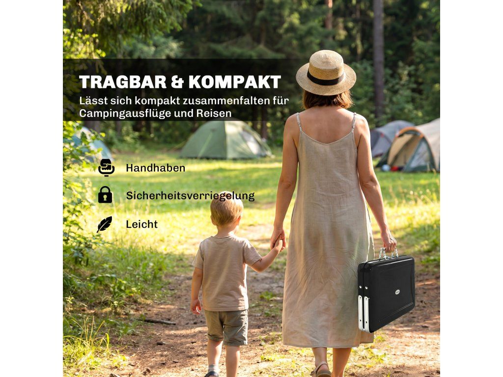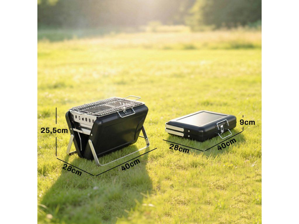 Provedení v kufříku: Tento inovativní přenosný gril na dřevěné uhlí je extrémně kompaktní, měří 40 x 28 x 9 cm a váží pouhé 4 kg. Je vybaven praktickou rukojetí a bezpečnostním zámkem, takže je ideální pro kempování nebo neformální zahradní párty.