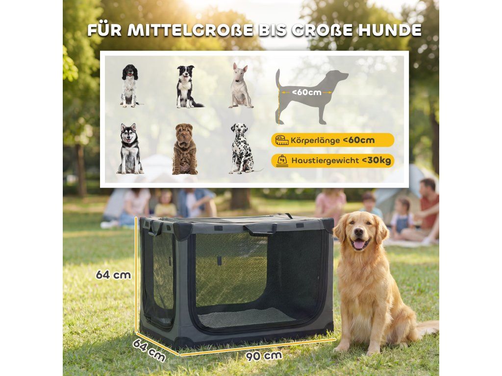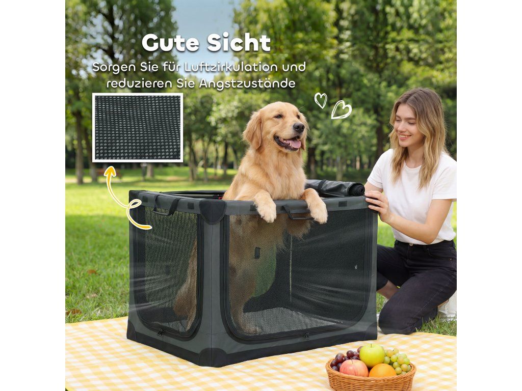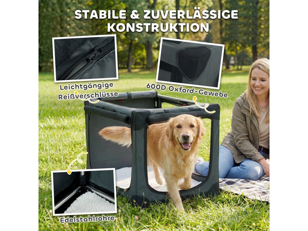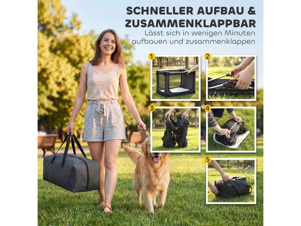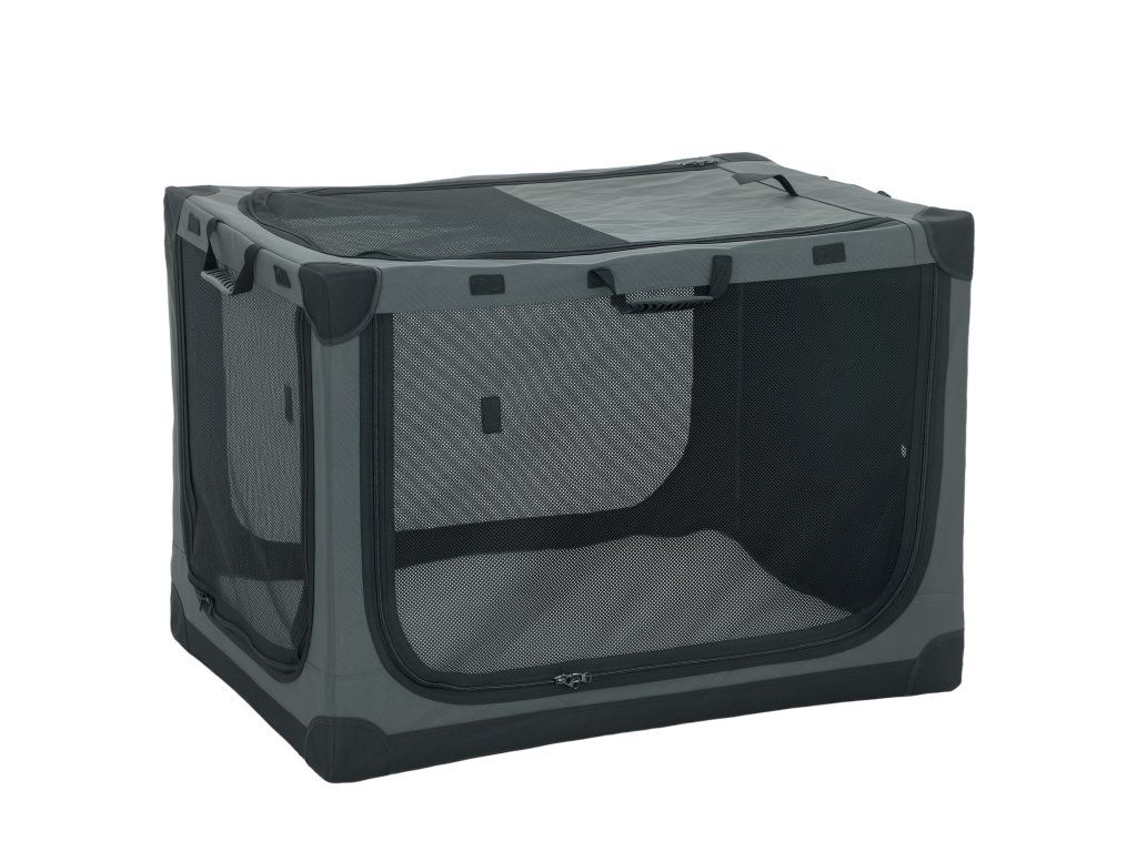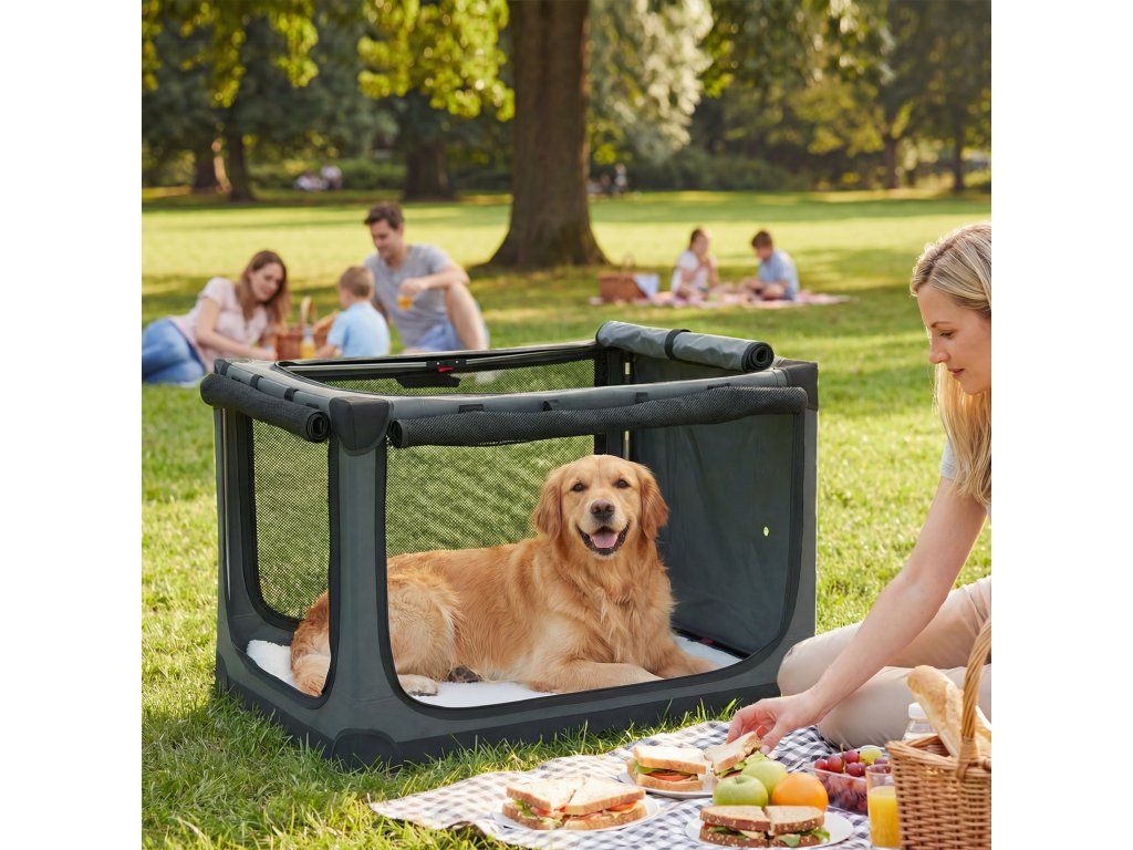Při cestování nebo při nečekané návštěvě může neklidný pes rychle uniknout a způsobit stres. Viklající se přepravka se může prohýbat nebo kroutit a tuhé uzávěry způsobují, že krátké prohlídky jsou stresující. Měkký skládací box na přepravu psů řeší tento problém: díky 8-ti tyčovému skládacímu rámu jej lze rychle postavit a uložit naplocho, pevná konstrukce 600D a zip s hladkým chodem zajišťují uvolněné ovládání.