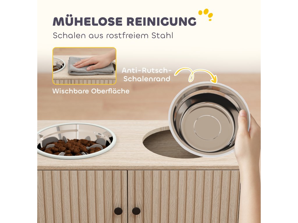 ✔ Obsahuje dvě misky z nerezové oceli o objemu 2 l, které jsou odolné a hygienické.
