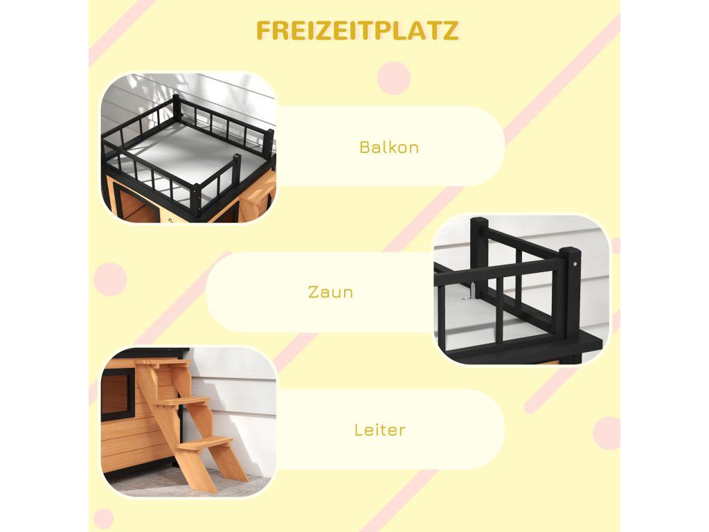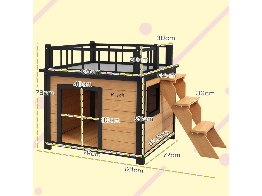 Malá střešní terasa: Krásná malá vyhlídková plošina zve vašeho mazlíčka k relaxaci. Vyvýšený design malého domku pro zvířata také chrání vašeho mazlíčka před vypadnutím, pokud se během spánku pohybuje.