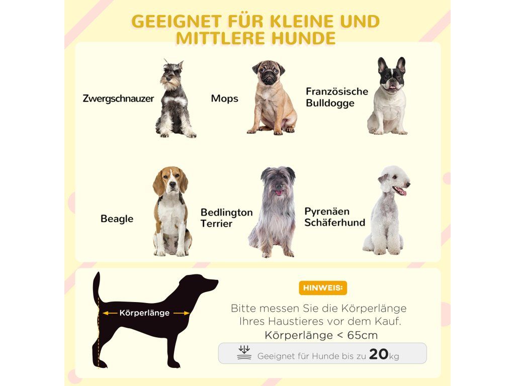✔ Vhodné pro malé a střední psy do 20 kg (44 liber) a délky 65 cm (28 palců), jako jsou corgi, bíglové, harriéři a další.