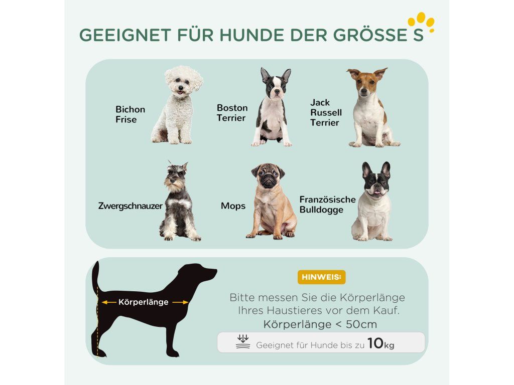✔ Vhodné pro malé psy do délky 50 cm a hmotnosti 10 kg.