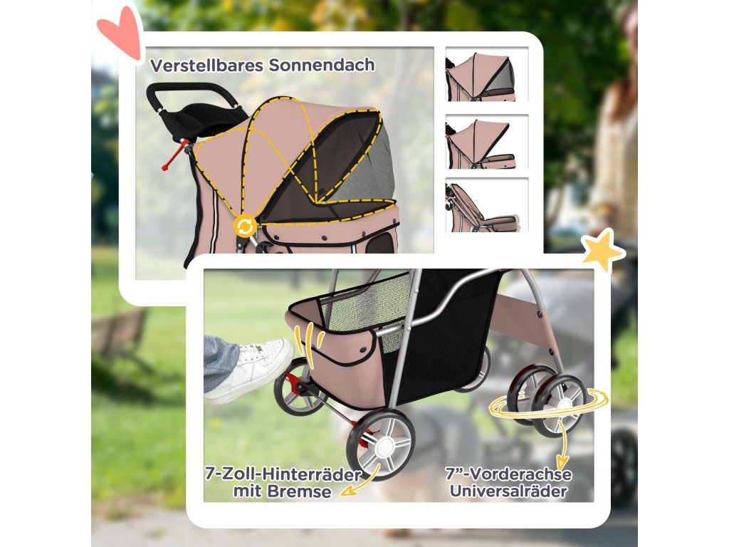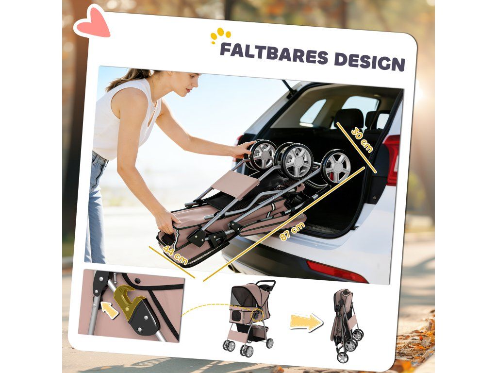 Snadné skládání: Tento kočárek pro psy, navržený speciálně pro zaneprázdněné majitele domácích mazlíčků, se složí během několika sekund díky rychloskládacímu mechanismu – ideální pro úsporu místa v kufru auta nebo doma. Obsahuje dva držáky na nápoje a prostorný košík na pamlsky, hračky a vše ostatní, co váš mazlíček potřebuje.