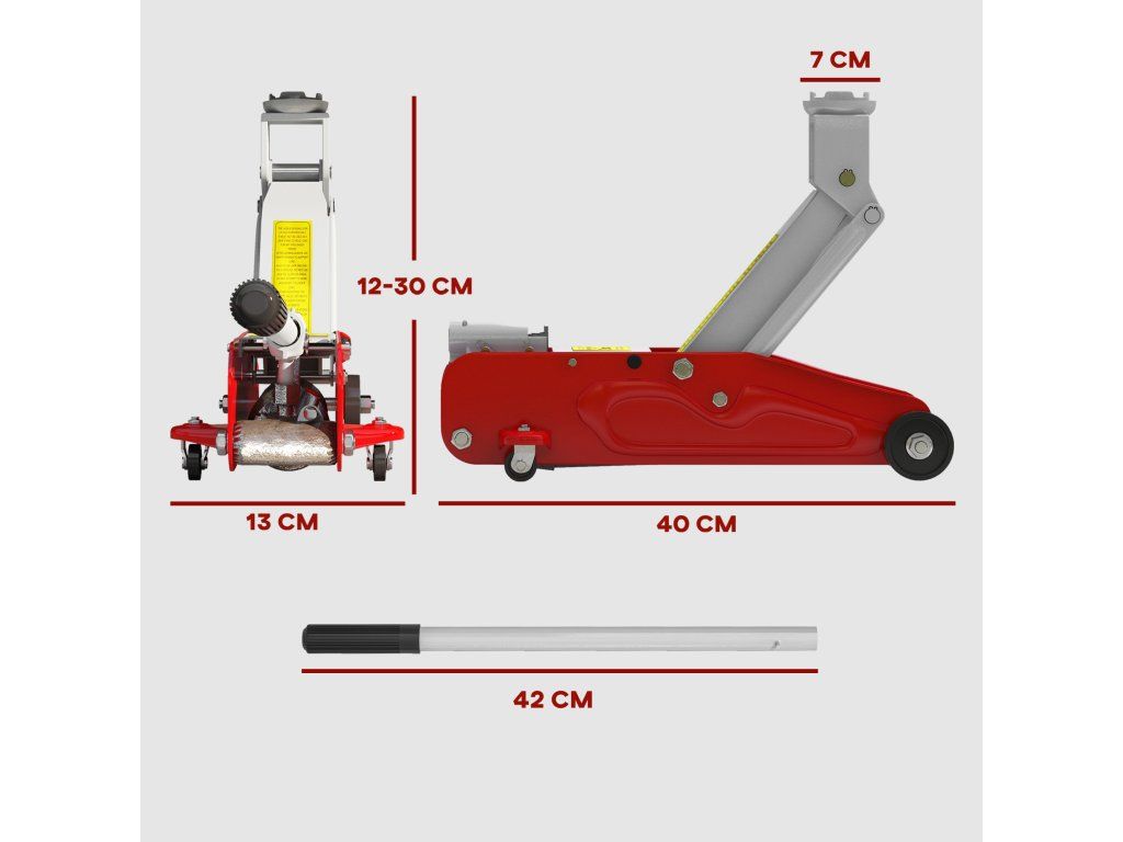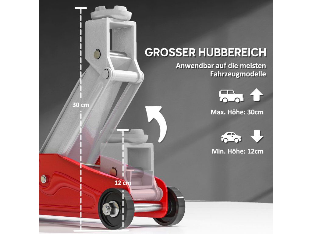 Robustní nosnost a flexibilita: S nosností 2 tuny a výškou zdvihu 12–30 cm je tento zvedák ideální pro výměnu pneumatik u automobilů, SUV nebo snížených vozidel a zajišťuje bezproblémové opravy.